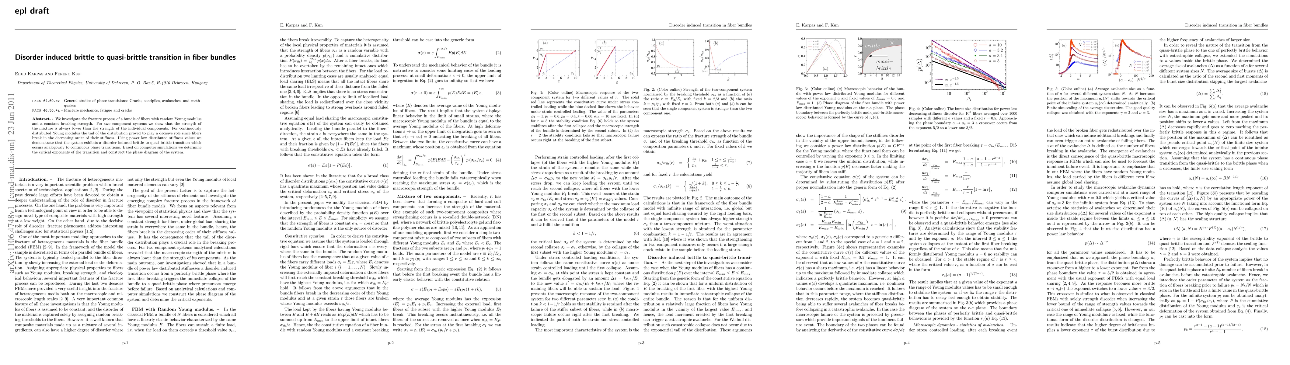 This paper explores the fracture behavior in fiber bundles with varying stiffness and constant breaking strength, demonstrating that mixtures are weaker than individual components. It reveals a disorder-induced transition from brittle to quasi-brittle behavior, akin to continuous phase transitions, and identifies critical exponents through simulations.