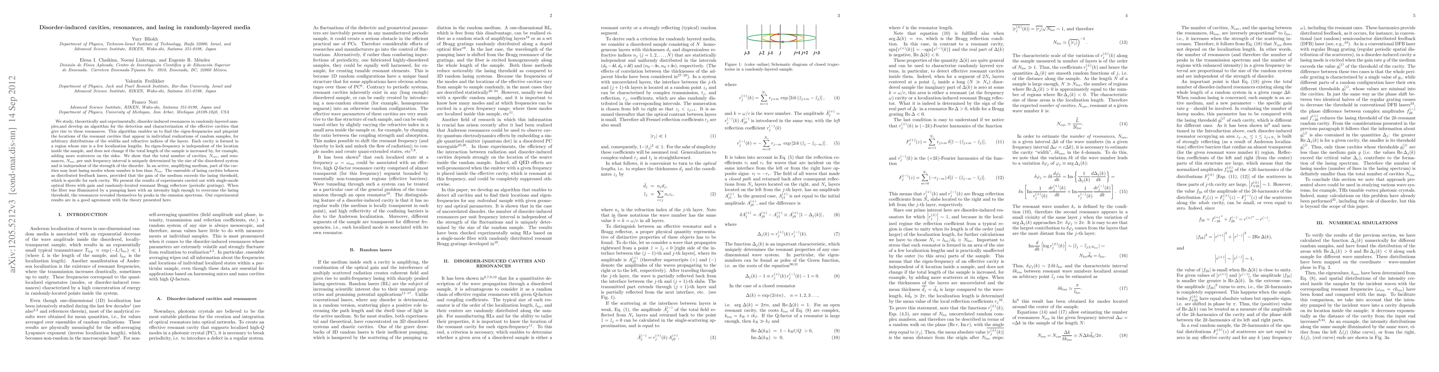 This paper theoretically and experimentally investigates disorder-induced resonances in randomly-layered media, developing an algorithm to detect and characterize effective cavities. The study reveals that the number of cavities and resonances is determined by the system size, independent of disorder strength, and demonstrates lasing modes in amplifying media, behaving as distributed feedback lasers. Experimental results using optical fibers with Bragg reflectors confirm the theoretical findings.