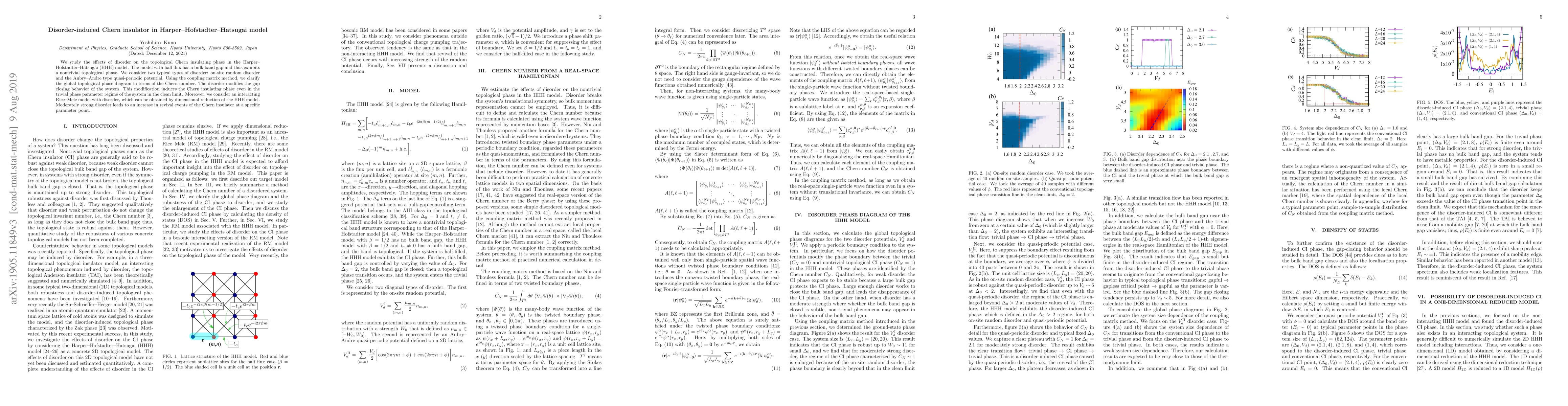 We study the effects of disorder on the topological Chern insulating phase in the Harper--Hofstadter--Hatsugai (HHH) model. The model with half flux has a bulk band gap and thus exhibits a nontrivial topological phase. We consider two typical types of disorder: on-site random disorder and the Aubry--Andre type quasi-periodic potential. Using the coupling matrix method, we clarify the global topological phase diagram in terms of the Chern number. The disorder modifies the gap closing behavior of the system. This modification induces the Chern insulating phase even in the trivial phase parameter regime of the system in the clean limit. Moreover, we consider an interacting Rice--Mele model with disorder, which can be obtained by dimensional reduction of the HHH model. Moderately strong disorder leads to an increase in revival events of the Chern insulator at a specific parameter point.