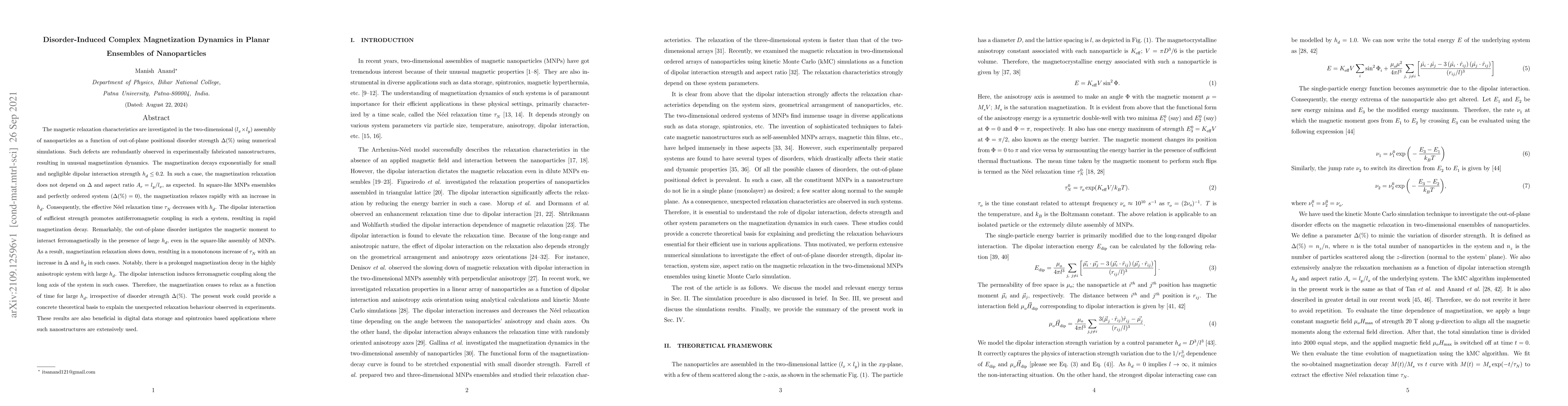 The magnetic relaxation characteristics are investigated in the two-dimensional ($l^{}_x\times l^{}_y$) assembly of nanoparticles as a function of out-of-plane positional disorder strength $\Delta(\%)$ using numerical simulations. Such defects are redundantly observed in experimentally fabricated nanostructures, resulting in unusual magnetization dynamics. The magnetization decays exponentially for small and negligible dipolar interaction strength $h^{}_d\leq0.2$. In such a case, the magnetization relaxation does not depend on $\Delta$ and aspect ratio $A^{}_r=l^{}_y/l^{}_x$, as expected. In square-like MNPs ensembles and perfectly ordered system ($\Delta(\%)=0$), the magnetization relaxes rapidly with an increase in $h^{}_d$. Consequently, the effective N\'eel relaxation time $\tau^{}_N$ decreases with $h^{}_d$. The dipolar interaction of sufficient strength promotes antiferromagnetic coupling in such a system, resulting in rapid magnetization decay. Remarkably, the out-of-plane disorder instigates the magnetic moment to interact ferromagnetically in the presence of large $h^{}_d$, even in the square-like assembly of MNPs. As a result, magnetization relaxation slows down, resulting in a monotonous increase of $\tau^{}_N$ with an increase in $\Delta$ and $h^{}_d$ in such cases. Notably, there is a prolonged magnetization decay in the highly anisotropic system with large $h^{}_d$. The dipolar interaction induces ferromagnetic coupling along the long axis of the system in such cases. Therefore, the magnetization ceases to relax as a function of time for large $h^{}_d$, irrespective of disorder strength $\Delta(\%)$. The present work could provide a concrete theoretical basis to explain the unexpected relaxation behaviour observed in experiments. These results are also beneficial in digital data storage and spintronics based applications where such nanostructures are extensively used.
