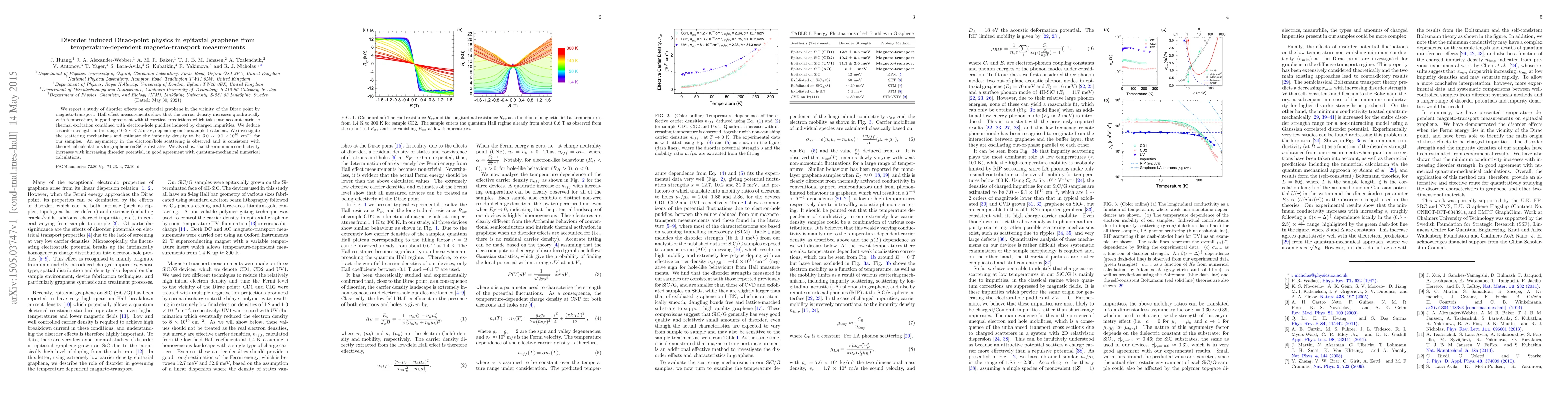 This study examines the effects of disorder on epitaxial graphene's magneto-transport properties, finding carrier density increases quadratically with temperature due to intrinsic thermal excitation and impurity-induced puddles. The research deduces disorder strengths and impurity densities, revealing an asymmetry in electron/hole scattering consistent with theoretical models.