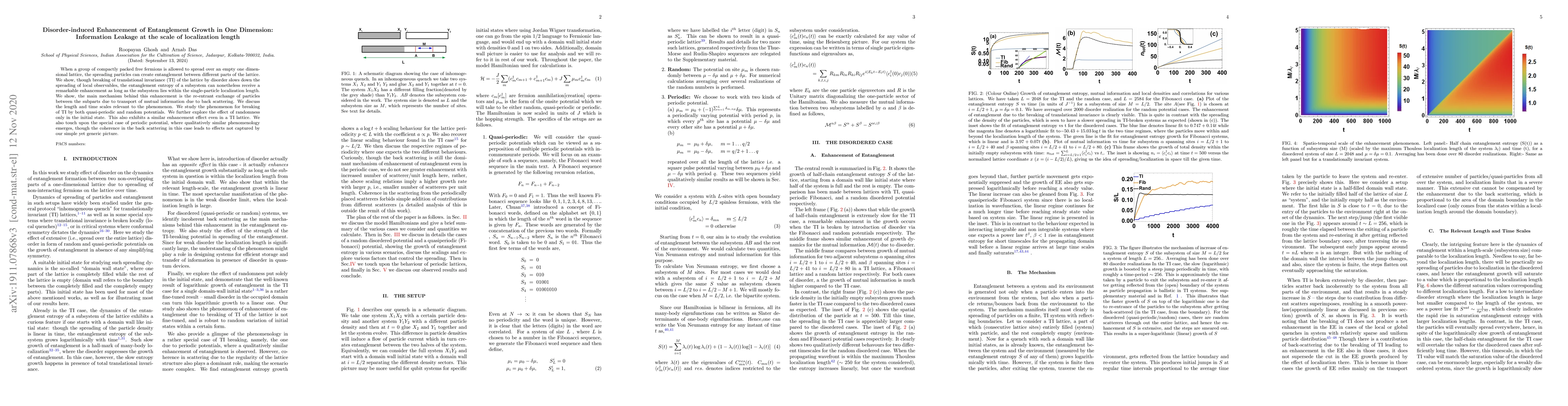 When a group of compactly packed free fermions is allowed to spread over an empty one-dimensional lattice, the spreading particles can create entanglement between different parts of the lattice. We show, though breaking of translational invariance (TI) of the lattice by disorder slows down the spreading of local observables, the entanglement entropy of a subsystem can nonetheless receive a remarkable enhancement as long as the subsystem lies within the single-particle localization length. We show, the main mechanism behind this enhancement is the re-entrant exchange of particles between the subparts due to transport of mutual information due to back scattering. We discuss the length and time scales relevant to the phenomenon. We study the phenomenon for breaking of TI by both quasi-periodic and random potentials. We further explore the effect of randomness only in the initial state. This also exhibits a similar enhancement effect even in a TI lattice. We also touch upon the special case of periodic potential, where qualitatively similar phenomenology emerges, though the coherence in the back scattering in this case leads to effects not captured by our simple yet generic picture.