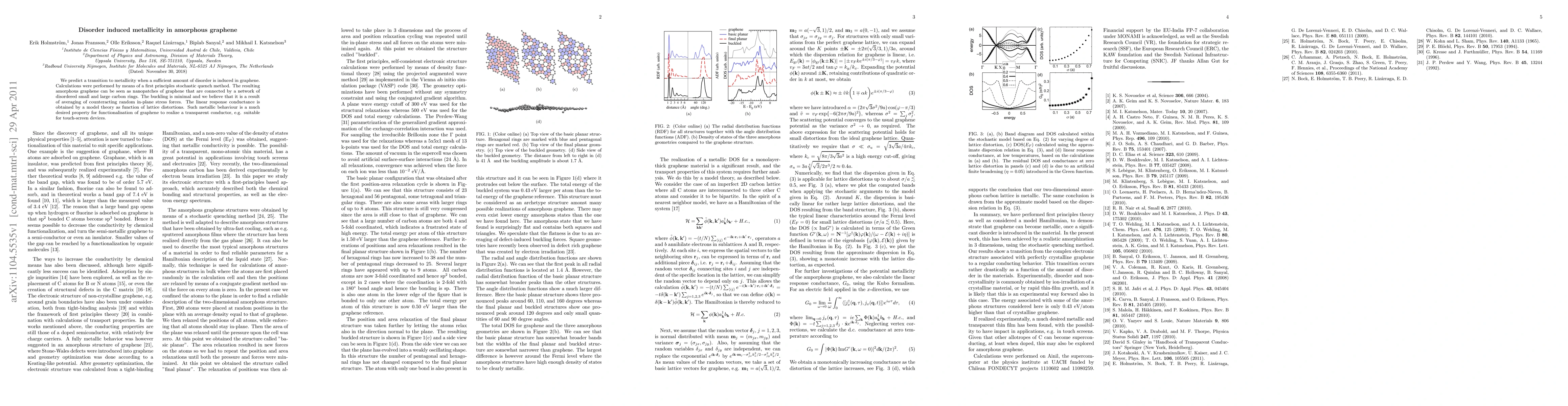 This research predicts that introducing sufficient disorder into graphene leads to a transition to metallicity, achieved via a first-principles stochastic quench method. The resulting amorphous graphene exhibits minimal buckling and metallic behavior, making it a potential transparent conductor for applications like touch-screen devices.
