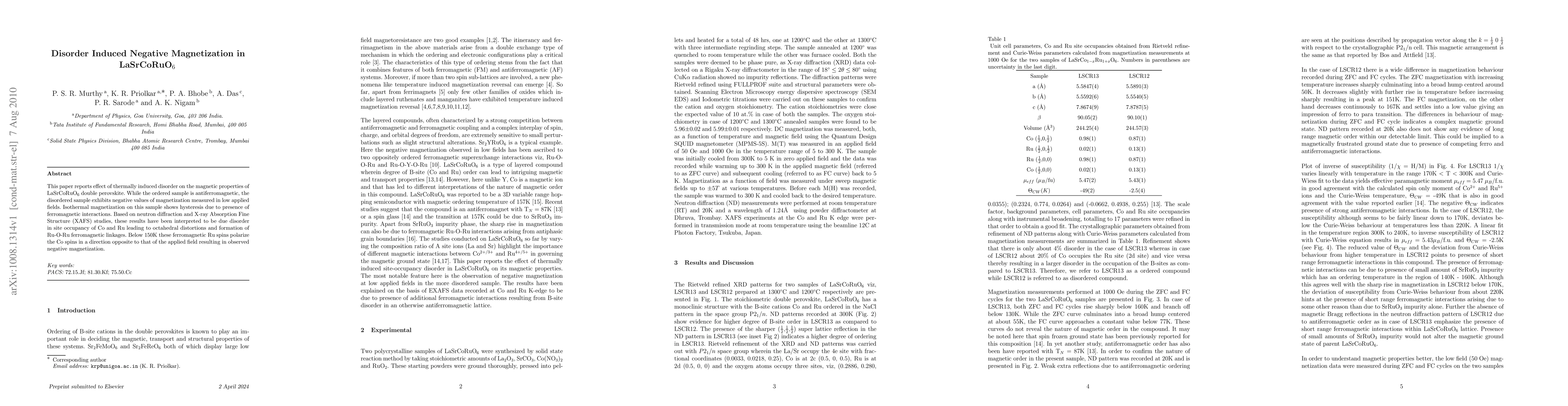 This paper reports effect of thermally induced disorder on the magnetic properties of LaSrCoRuO6 double perovskite. While the ordered sample is antiferromagnetic, the disordered sample exhibits negative values of magnetization measured in low applied fields. Isothermal magnetization on this sample shows hysteresis due to presence of ferromagnetic interactions. Based on neutron diffraction and X-ray Absorption Fine Structure (XAFS) studies, these results have been interpreted to be due disorder in site occupancy of Co and Ru leading to octahedral distortions and formation of Ru-O-Ru ferromagnetic linkages. Below 150K these ferromagnetic Ru spins polarize the Co spins in a direction opposite to that of the applied field resulting in observed negative magnetization.