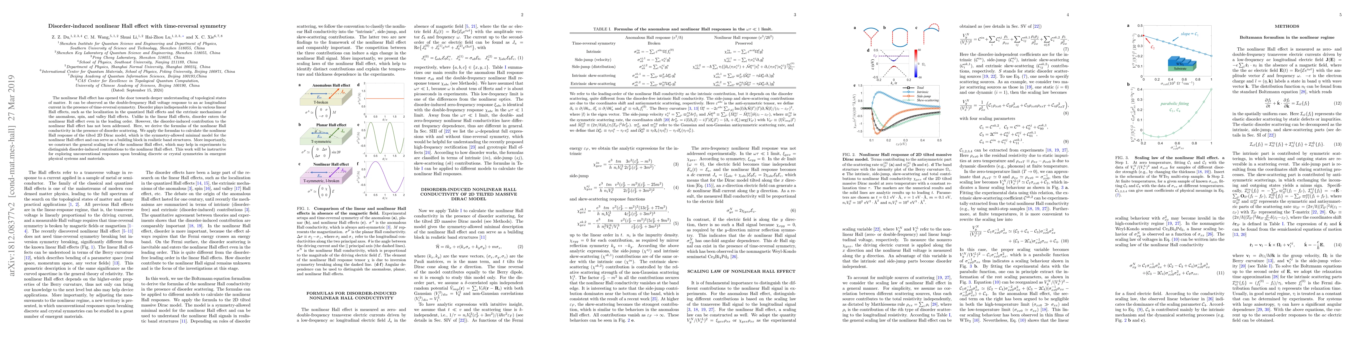 This research explores the disorder-induced nonlinear Hall effect in the presence of time-reversal symmetry, deriving formulas for nonlinear Hall conductivity and applying them to a 2D Dirac model. The study aims to identify general scaling laws to distinguish disorder-induced contributions, providing insights into unconventional responses in emergent physical systems.