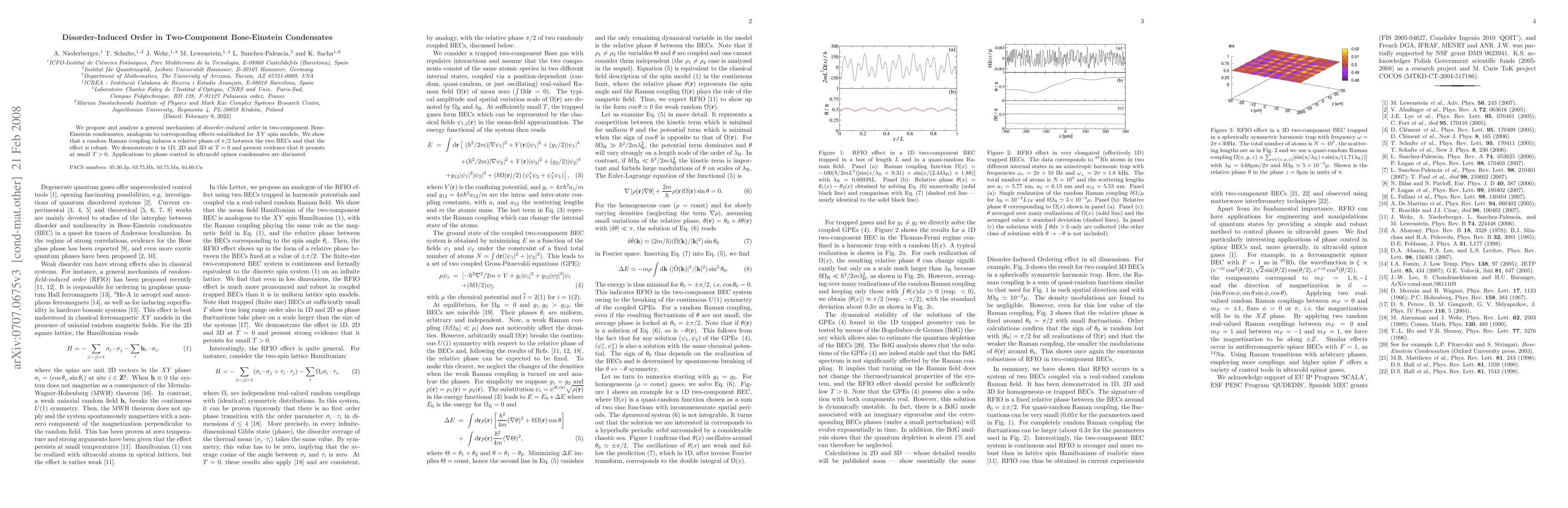 This paper proposes a mechanism for disorder-induced order in two-component Bose-Einstein condensates, demonstrating that random Raman coupling creates a robust pi/2 relative phase between the components. The effect is shown to persist in 1D, 2D, and 3D at zero and small positive temperatures, with implications for phase control in ultracold spinor condensates.