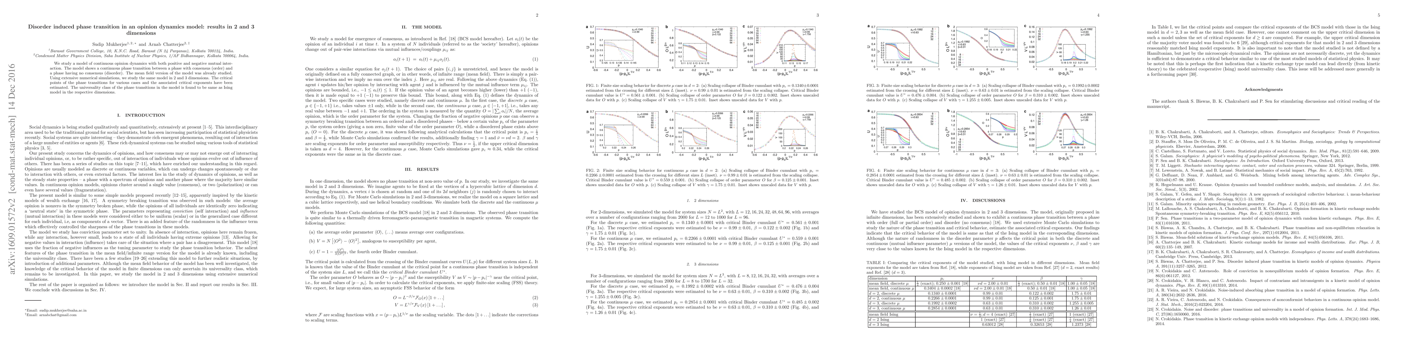 This paper investigates the phase transition in a continuous opinion dynamics model with positive and negative interactions, finding a transition from consensus to disorder. Numerical simulations in 2D and 3D reveal critical points and exponents, showing the universality class matches the Ising model in respective dimensions.