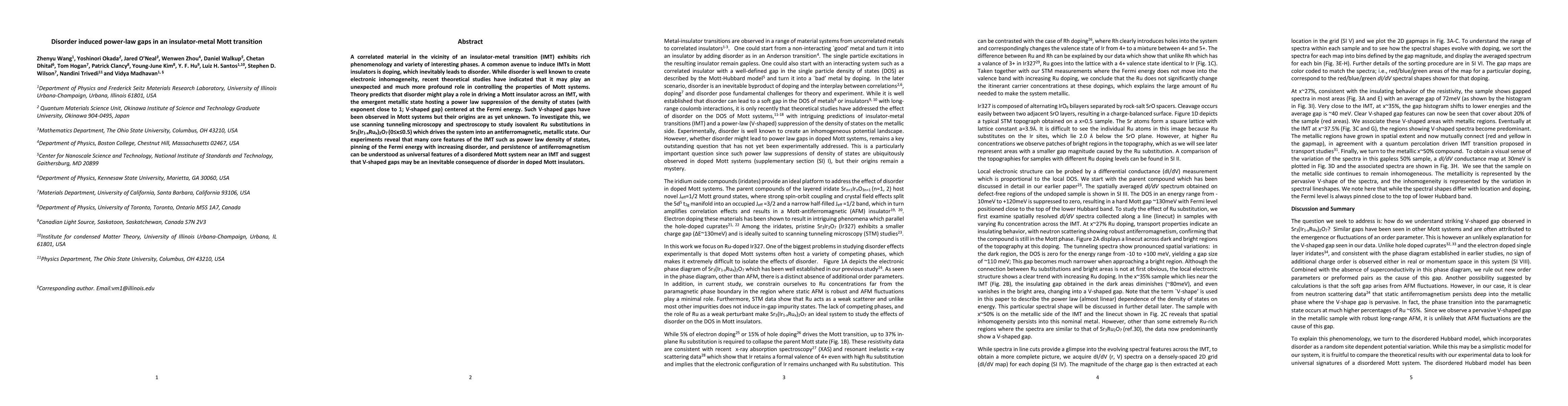 This paper investigates the role of disorder in inducing a Mott insulator-metal transition, revealing that disorder can drive the transition and lead to a power-law suppression of the density of states, termed V-shaped gaps, in the metallic state. Experiments on Sr$_3$(Ir$_{1-x}$Ru$_x$)$_2$O$_7$ confirm these universal features of disordered Mott systems.