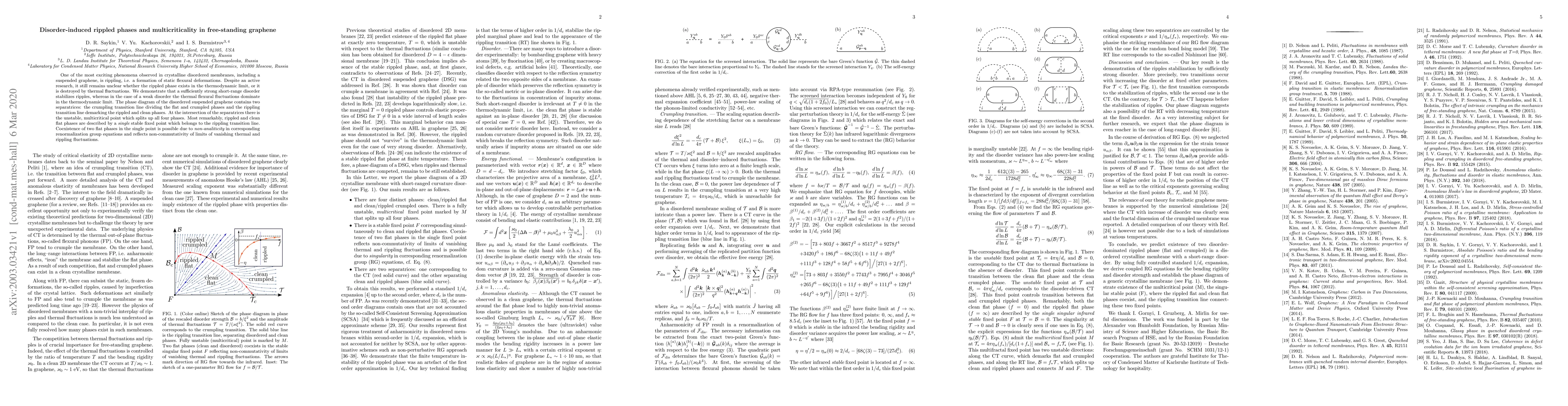 One of the most exciting phenomena observed in crystalline disordered membranes, including a suspended graphene, is rippling, i.e. a formation of static flexural deformations. Despite an active research, it still remains unclear whether the rippled phase exists in the thermodynamic limit, or it is destroyed by thermal fluctuations. We demonstrate that a sufficiently strong short-range disorder stabilizes ripples, whereas in the case of a weak disorder the thermal flexural fluctuations dominate in the thermodynamic limit. The phase diagram of the disordered suspended graphene contains two separatrices: the crumpling transition line dividing the flat and crumpled phases and the rippling transition line demarking the rippled and clean phases. At the intersection of the separatrices there is the unstable, multicritical point which splits up all four phases. Most remarkably, rippled and clean flat phases are described by a single stable fixed point which belongs to the rippling transition line. Coexistence of two flat phases in the single point is possible due to non-analiticity in corresponding renormalization group equations and reflects non-commutativity of limits of vanishing thermal and rippling fluctuations.