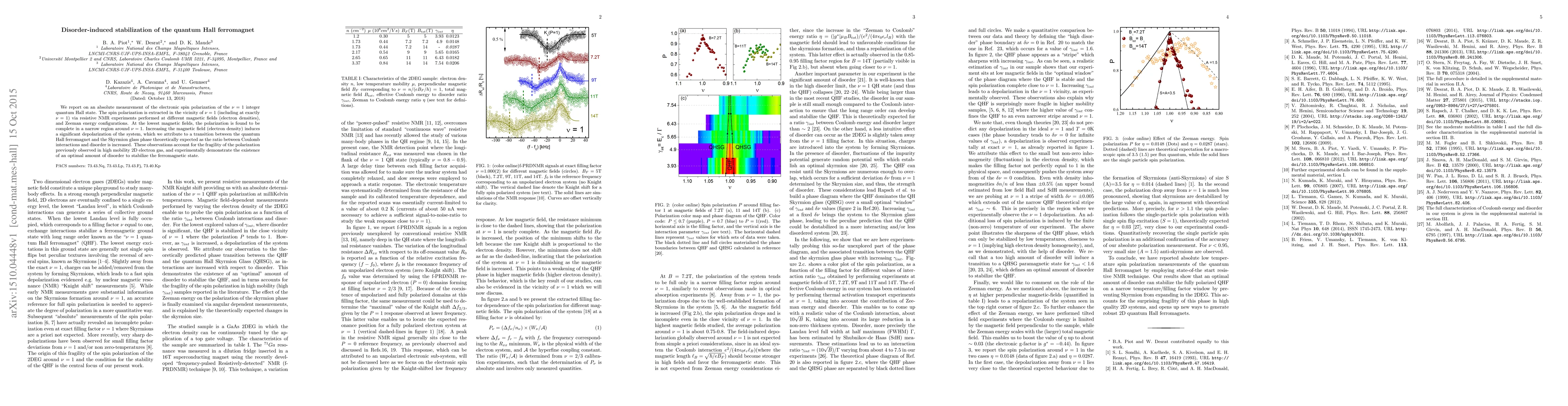 We report on an absolute measurement of the electronic spin polarization of the $\nu=1$ integer quantum Hall state. The spin polarization is extracted in the vicinity of $\nu=1$ (including at exactly $\nu=1$) via resistive NMR experiments performed at different magnetic fields (electron densities), and Zeeman energy configurations. At the lowest magnetic fields, the polarization is found to be complete in a narrow region around $\nu=1$. Increasing the magnetic field (electron density) induces a significant depolarization of the system, which we attribute to a transition between the quantum Hall ferromagnet and the Skyrmion glass phase theoretically expected as the ratio between Coulomb interactions and disorder is increased. These observations account for the fragility of the polarization previously observed in high mobility 2D electron gas, and experimentally demonstrate the existence of an optimal amount of disorder to stabilize the ferromagnetic state.