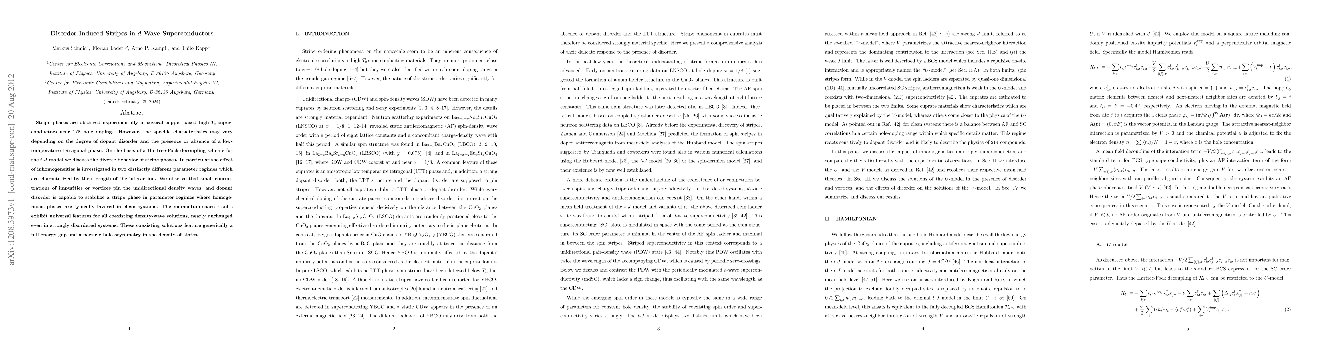 This research uses a Hartree-Fock decoupling scheme for the t-J model to investigate stripe phases in d-wave superconductors. It finds that disorder, including impurities or vortices, stabilizes stripe phases, even in regimes where homogeneous phases are usually preferred in clean systems. The study reveals universal features in momentum space for all coexisting density-wave solutions, including a full energy gap and particle-hole asymmetry in the density of states.