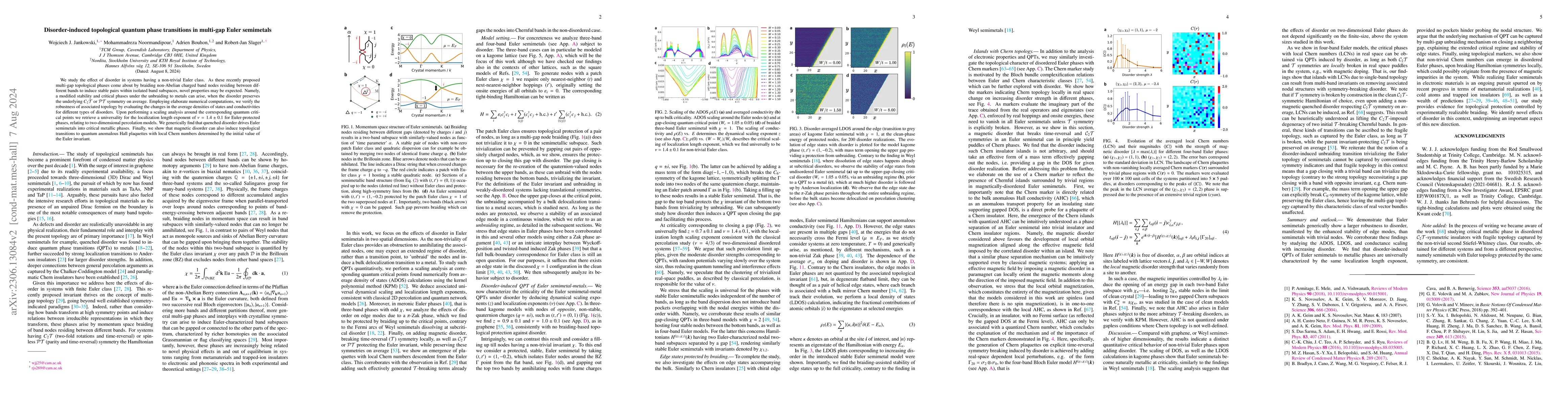 We study the effect of disorder in systems having a non-trivial Euler class. As these recently proposed multi-gap topological phases come about by braiding non-Abelian charged band nodes residing between different bands to induce stable pairs within isolated band subspaces, novel properties that include a finite critical phase under the debraiding to a metal rather than a transition point and a modified stability may be expected when the disorder preserves the underlying $C_2\cal{T}$ or $\cal{P}\cal{T}$ symmetry on average. Employing elaborate numerical computations, we verify the robustness of associated topology by evaluating the changes in the average densities of states and conductivities for different types of disorders. Upon performing a scaling analysis around the corresponding quantum critical points we retrieve a universality for the localization length exponent of $\nu = 1.4 \pm 0.1$ for Euler-protected phases, relating to 2D percolation models. We generically find that quenched disorder drives Euler semimetals into critical metallic phases. Finally, we show that magnetic disorder can also induce topological transitions to quantum anomalous Hall plaquettes with local Chern numbers determined by the initial value of the Euler invariant.