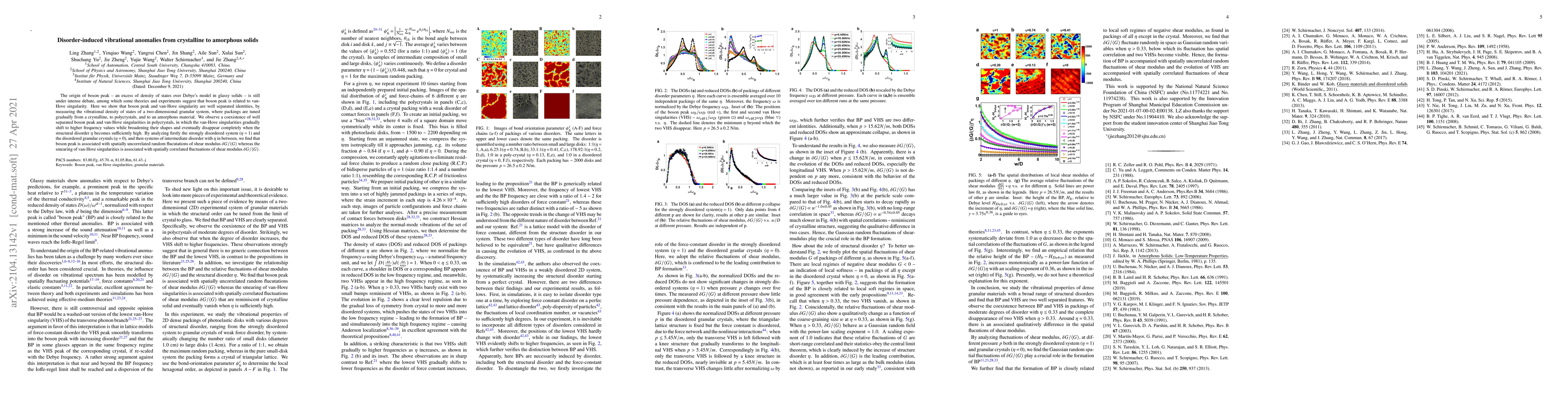 This study investigates the vibrational anomalies in granular systems transitioning from crystalline to amorphous states, finding that the boson peak and van-Hove singularities are distinct phenomena. The boson peak correlates with uncorrelated shear modulus fluctuations, while the smearing of van-Hove singularities is linked to correlated shear modulus fluctuations.
