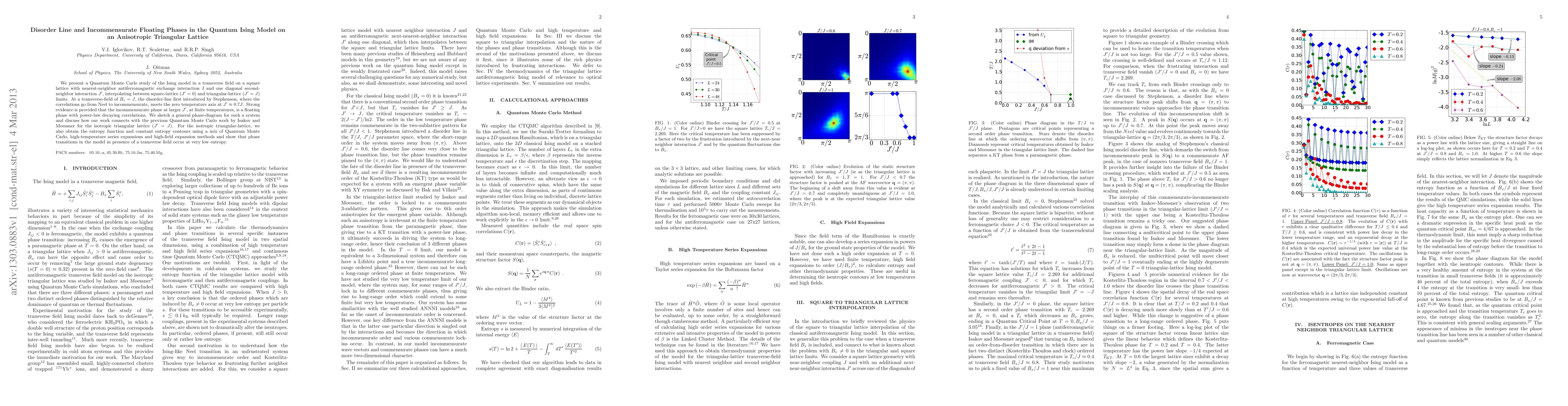 We present a Quantum Monte Carlo study of the Ising model in a transverse field on a square lattice with nearest-neighbor antiferromagnetic exchange interaction J and one diagonal second-neighbor interaction $J'$, interpolating between square-lattice ($J'=0$) and triangular-lattice ($J'=J$) limits. At a transverse-field of $B_x=J$, the disorder-line first introduced by Stephenson, where the correlations go from Neel to incommensurate, meets the zero temperature axis at $J'\approx 0.7 J$. Strong evidence is provided that the incommensurate phase at larger $J'$, at finite temperatures, is a floating phase with power-law decaying correlations. We sketch a general phase-diagram for such a system and discuss how our work connects with the previous Quantum Monte Carlo work by Isakov and Moessner for the isotropic triangular lattice ($J'=J$). For the isotropic triangular-lattice, we also obtain the entropy function and constant entropy contours using a mix of Quantum Monte Carlo, high-temperature series expansions and high-field expansion methods and show that phase transitions in the model in presence of a transverse field occur at very low entropy.