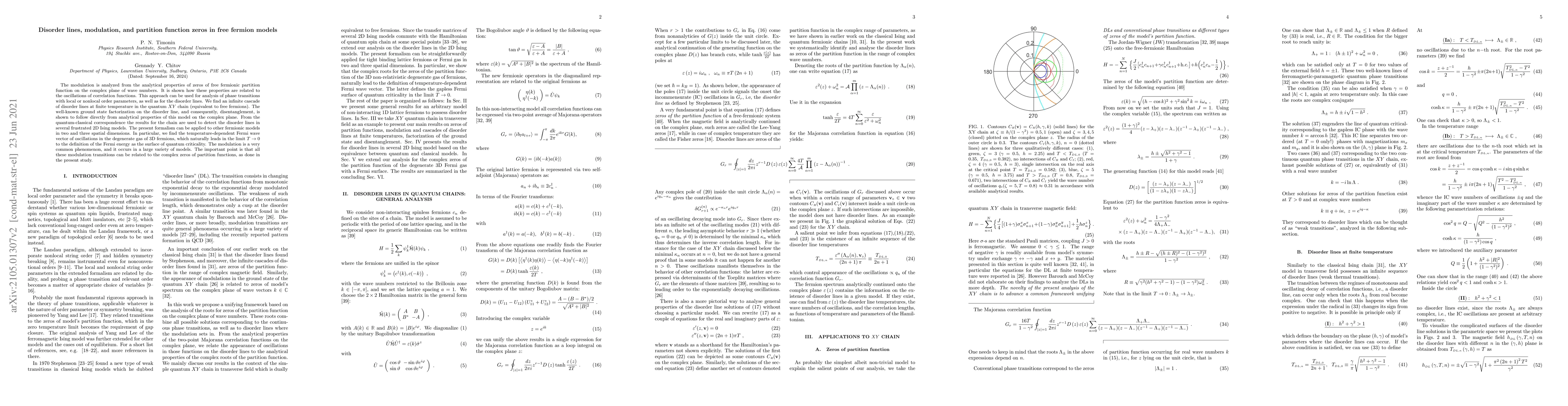 The modulation is analyzed from the analytical properties of zeros of free fermionic partition function on the complex plane of wave numbers. It is shown how these properties are related to the oscillations of correlation functions. This approach can be used for analysis of phase transitions with local or nonlocal order parameters, as well as for the disorder lines. We find an infinite cascade of disorder lines at finite temperature in the quantum $XY$ chain (equivalent to free fermions). The well-known ground state factorization on the disorder line, and consequently, disentanglement, is shown to follow directly from analytical properties of this model on the complex plane. From the quantum-classical correspondence the results for the chain are used to detect the disorder lines in several frustrated 2D Ising models. The present formalism can be applied to other fermionic models in two and three spatial dimensions. In particular, we find the temperature-dependent Fermi wave vector of oscillations in the degenerate gas of 3D fermions, which naturally leads in the limit $T \to 0$ to the definition of the Fermi energy as the surface of quantum criticality. The modulation is a very common phenomenon, and it occurs in a large variety of models. The important point is that all these modulation transitions can be related to the complex zeros of partition functions, as done in the present study.