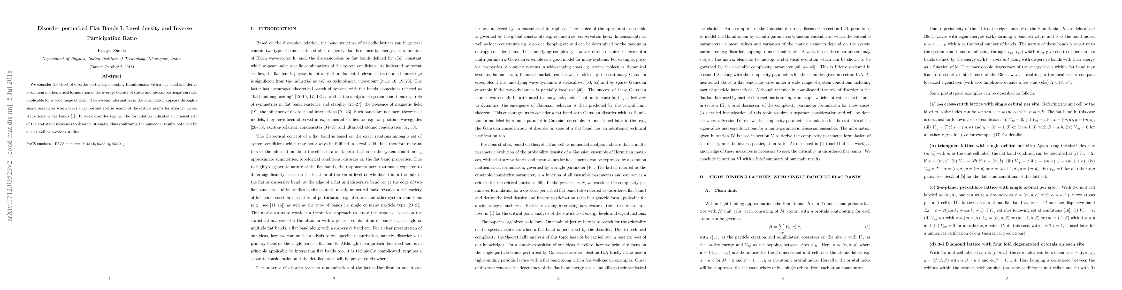 This paper investigates the impact of disorder on flat bands in tight-binding Hamiltonians, deriving a mathematical framework for average density of states and inverse participation ratio. The framework reveals insensitivity of statistical measures to disorder strength in weak disorder regimes, aligning with prior numerical studies.