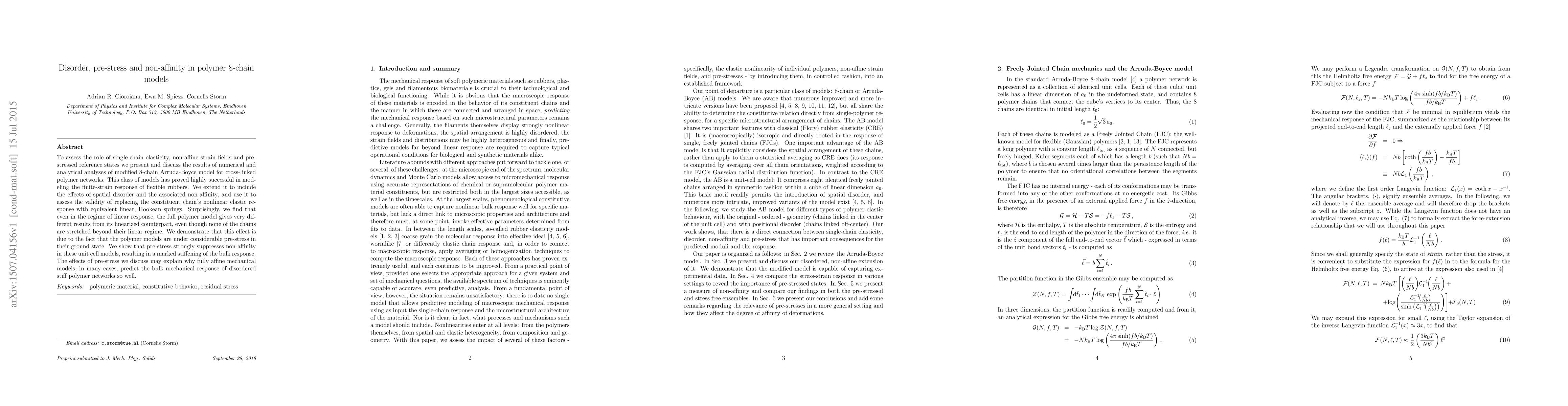 To assess the role of single-chain elasticity, non-affine strain fields and pre-stressed reference states we present and discuss the results of numerical and analytical analyses of modified 8-chain Arruda-Boyce model for cross-linked polymer networks. This class of models has proved highly successful in modeling the finite-strain response of flexible rubbers. We extend it to include the effects of spatial disorder and the associated non-affinity, and use it to assess the validity of replacing the constituent chain's nonlinear elastic response with equivalent linear, Hookean springs. Surprisingly, we find that even in the regime of linear response, the full polymer model gives very different results from its linearized counterpart, even though none of the chains are stretched beyond their linear regime. We demonstrate that this effect is due to the fact that the polymer models are under considerable pre-stress in their ground state. We show that pre-stress strongly suppresses non-affinity in these unit cell models, resulting in a marked stiffening of the bulk response. The effects of pre-stress we discuss may explain why fully affine mechanical models, in many cases, predict the bulk mechanical response of disordered stiff polymer networks so well.