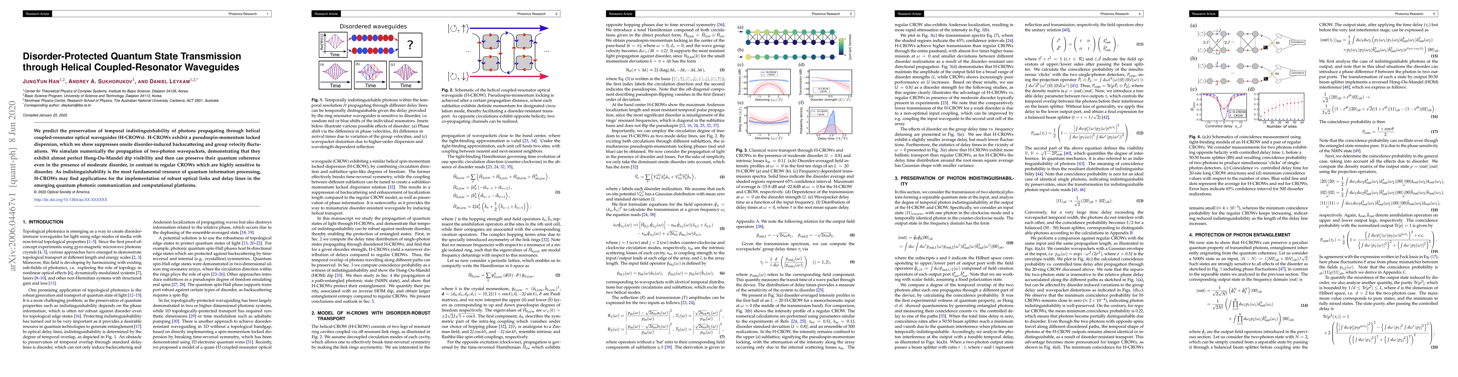 This paper predicts that helical coupled-resonator optical waveguides (H-CROWs) can maintain photon indistinguishability and coherence despite disorder, due to their pseudospin-momentum locked dispersion, which suppresses backscattering and group velocity fluctuations. This robustness could enable their use in quantum communication systems.