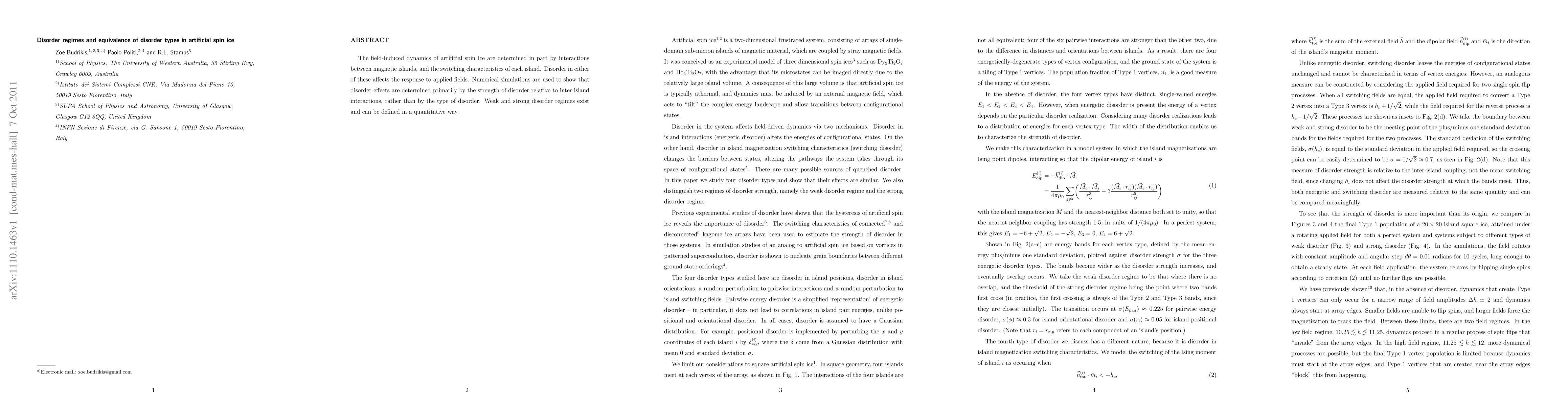 This paper investigates the dynamics of artificial spin ice under applied fields, revealing that disorder effects are primarily determined by the relative strength of disorder compared to inter-island interactions. Numerical simulations demonstrate that disorder types are equivalent in their impact, depending on whether they are weak or strong.