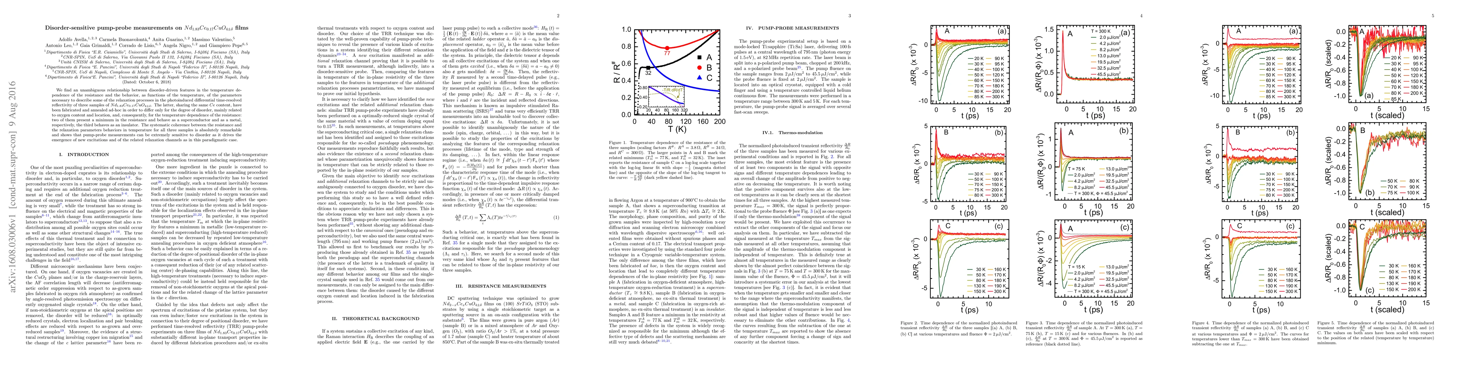 We find an unambiguous relationship between disorder-driven features in the temperature dependence of the resistance and the behavior, as functions of the temperature, of the parameters necessary to describe some of the relaxation processes in the photoinduced differential time-resolved reflectivity of three samples of Nd$_{1.83}$Ce$_{0.17}$CuO$_{4\pm\delta}$. The latter, sharing the same Ce content, have been fabricated and annealed ad-hoc in order to differ only for the degree of disorder, mainly related to oxygen content and location, and, consequently, for the temperature dependence of the resistance: two of them present a minimum in the resistance and behave as a superconductor and as a metal, respectively, the third behaves as an insulator. The systematic coherence between the resistance and the relaxation parameters behaviors in temperature for all three samples is absolutely remarkable and shows that pump-probe measurements can be extremely sensitive to disorder as it drives the emergence of new excitations and of the related relaxation channels as in this paradigmatic case.