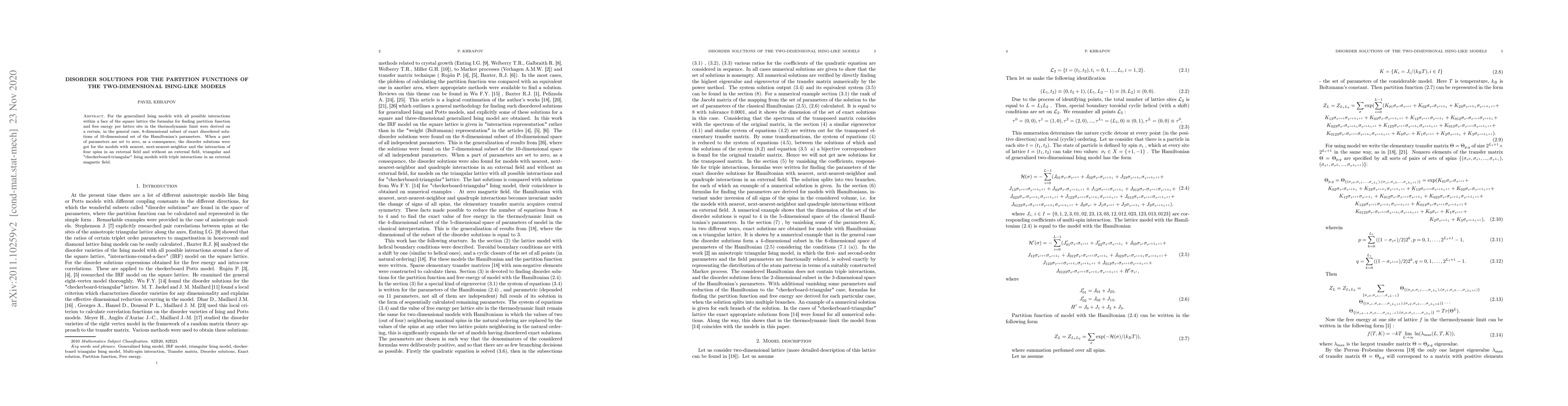 This paper derives formulas for partition functions and free energies of generalized Ising models on a square lattice, focusing on a 8-dimensional subset of exact disordered solutions. It also provides disorder solutions for specific models including triangular and "checkerboard-triangular" Ising models with triple interactions, both in and out of an external magnetic field.