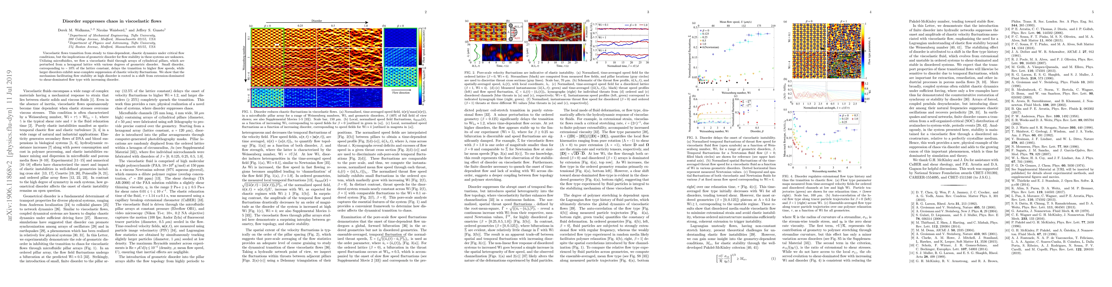 Geometric disorder in viscoelastic flows suppresses chaotic dynamics, with higher disorders showing near-complete stability, possibly due to a shift from extension-dominated to shear-dominated flow types.
