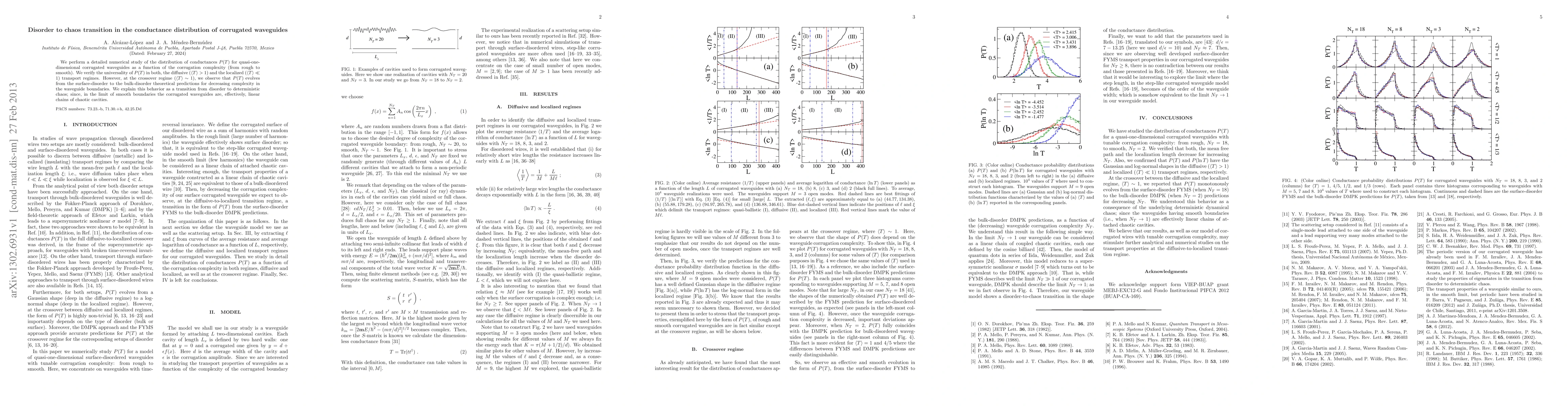 This study investigates the conductance distribution $P(T)$ in corrugated waveguides, finding that $P(T)$ transitions from surface-disorder to bulk-disorder predictions at the crossover regime. This transition is explained as a shift from disorder to deterministic chaos as waveguide boundary complexity decreases.