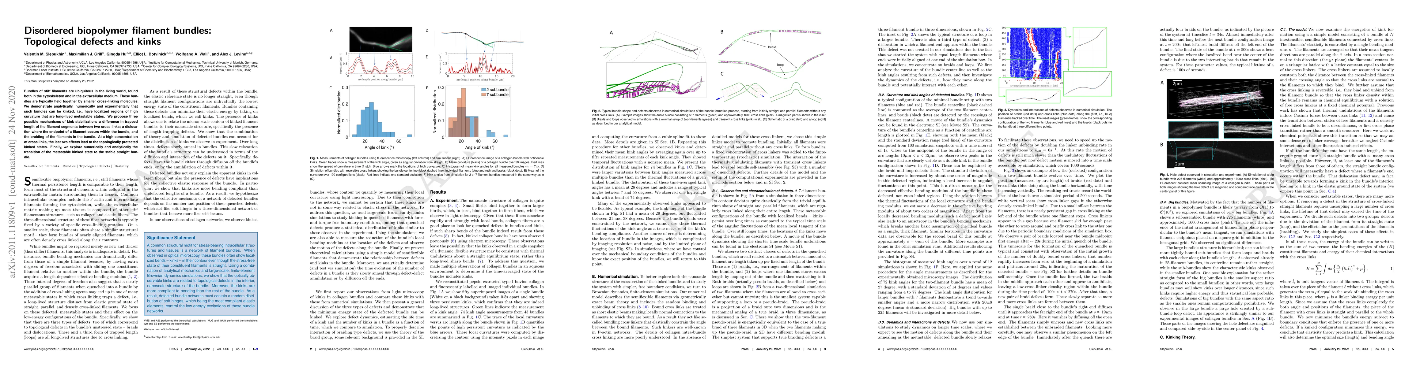 This paper investigates the topological defects and kinks in disordered biopolymer filament bundles, demonstrating their metastability through analytical, numerical, and experimental methods. It proposes mechanisms for kink stabilization and explores the transition from kinked to straight bundles under high cross-link concentrations.