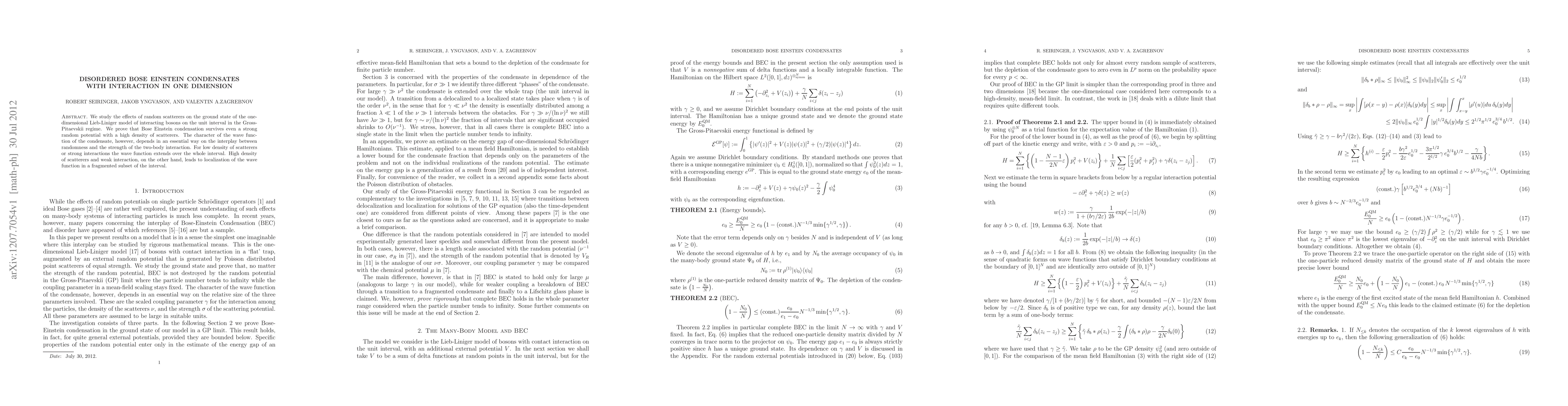 We study the effects of random scatterers on the ground state of the one-dimensional Lieb-Liniger model of interacting bosons on the unit interval in the Gross-Pitaevskii regime. We prove that Bose Einstein condensation survives even a strong random potential with a high density of scatterers. The character of the wave function of the condensate, however, depends in an essential way on the interplay between randomness and the strength of the two-body interaction. For low density of scatterers or strong interactions the wave function extends over the whole interval. High density of scatterers and weak interaction, on the other hand, leads to localization of the wave function in a fragmented subset of the interval.