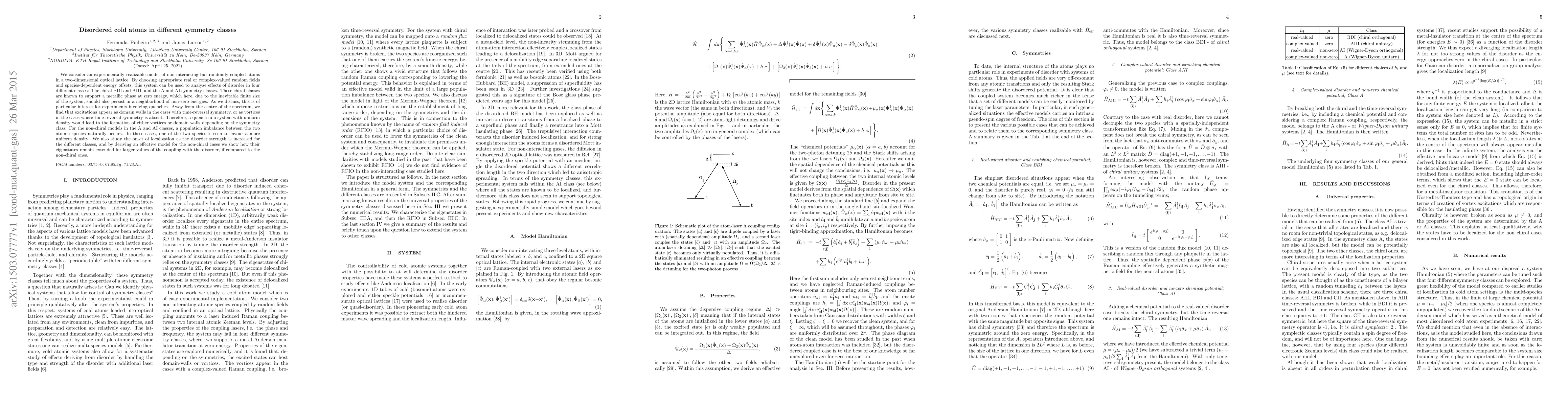 We consider an experimentally realizable model of non-interacting but randomly coupled atoms in a two-dimensional optical lattice. By choosing appropriate real or complex-valued random fields and species-dependent energy offsets, this system can be used to analyze effects of disorder in four different classes: The chiral BDI and AIII, and the A and AI symmetry classes. These chiral classes are known to support a metallic phase at zero energy, which here, due to the inevitable finite size of the system, should also persist in a neighborhood of non-zero energies. As we discuss, this is of particular interest for experiments involving quenches. Away from the centre of the spectrum, we find that excitations appear as domain walls in the cases with time-reversal symmetry, or as vortices in the cases where time-reversal symmetry is absent. Therefore, a quench in a system with uniform density would lead to the formation of either vortices or domain walls depending on the symmetry class. For the non-chiral models in the A and AI classes, a population imbalance between the two atomic species naturally occurs. In these cases, one of the two species is seen to favour a more uniform density. We also study the onset of localization as the disorder strength is increased for the different classes, and by deriving an effective model for the non-chiral cases we show how their eigenstates remain extended for larger values of the coupling with the disorder, if compared to the non-chiral ones.