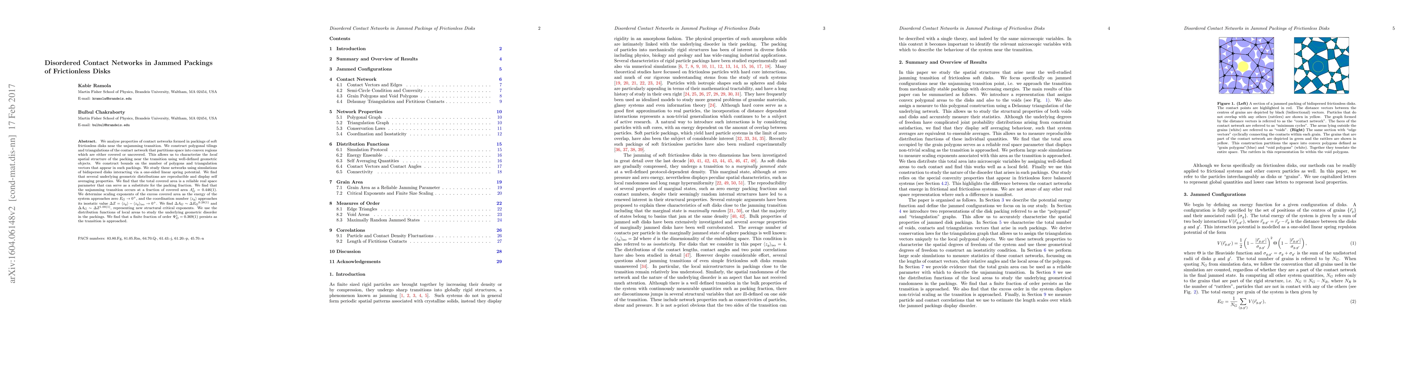 Researchers studied disordered contact networks in frictionless disk packings near their unjamming transition, finding that the total covered area is a reliable parameter and that the transition occurs at a fraction of 0.446, with scaling exponents related to energy and coordination number.