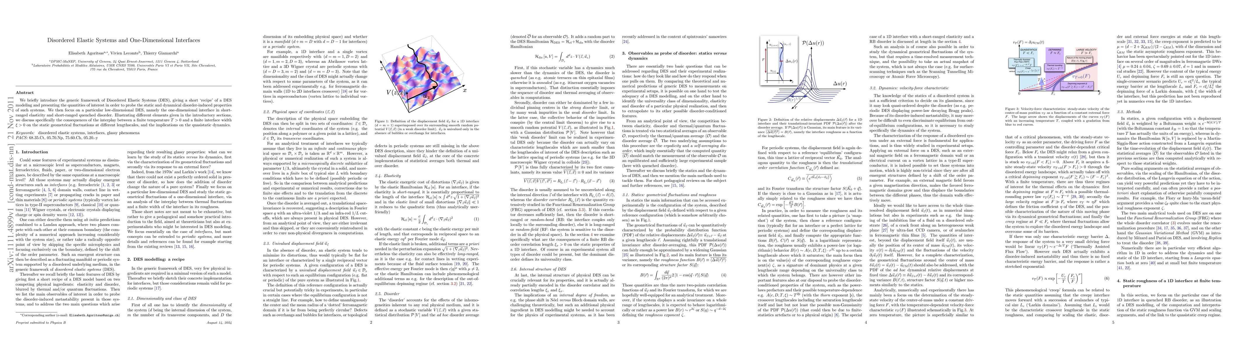 This paper introduces the framework for Disordered Elastic Systems (DES) and models their static and dynamical properties. It specifically examines one-dimensional interfaces in short-ranged elasticity and disorder, analyzing the effects of temperature and interface width on geometrical fluctuations and quasistatic dynamics.