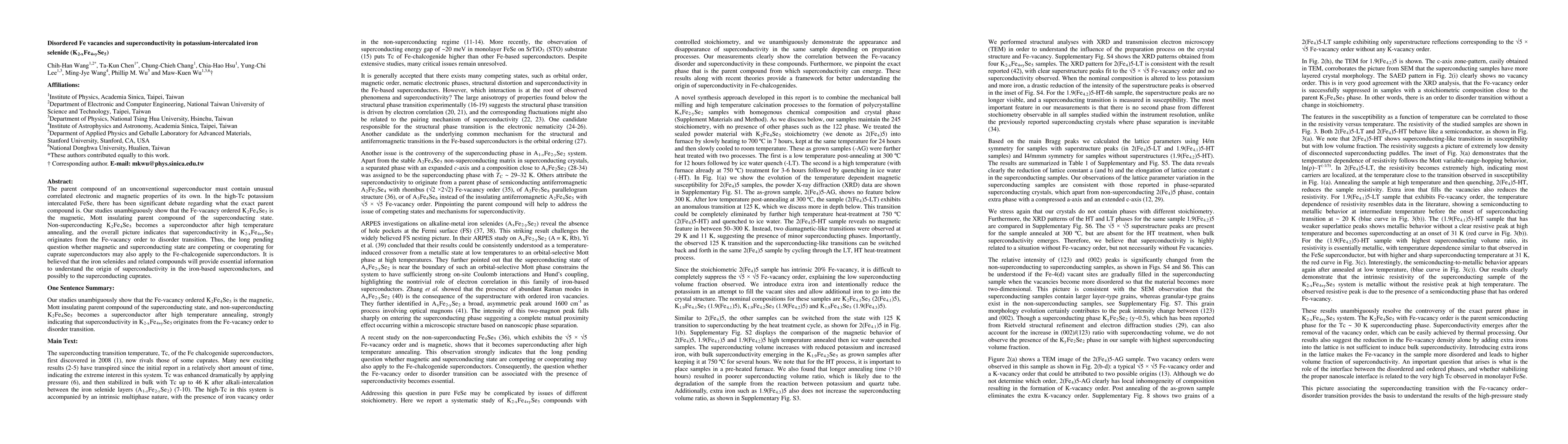 The parent compound of an unconventional superconductor must contain unusual correlated electronic and magnetic properties of its own. In the high-Tc potassium intercalated FeSe, there has been significant debate regarding what the exact parent compound is. Our studies unambiguously show that the Fe-vacancy ordered K2Fe4Se5 is the magnetic, Mott insulating parent compound of the superconducting state. Non-superconducting K2Fe4Se5 becomes a superconductor after high temperature annealing, and the overall picture indicates that superconductivity in K2-xFe4+ySe5 originates from the Fe-vacancy order to disorder transition. Thus, the long pending question whether magnetic and superconducting state are competing or cooperating for cuprate superconductors may also apply to the Fe-chalcogenide superconductors. It is believed that the iron selenides and related compounds will provide essential information to understand the origin of superconductivity in the iron-based superconductors, and possibly to the superconducting cuprates.