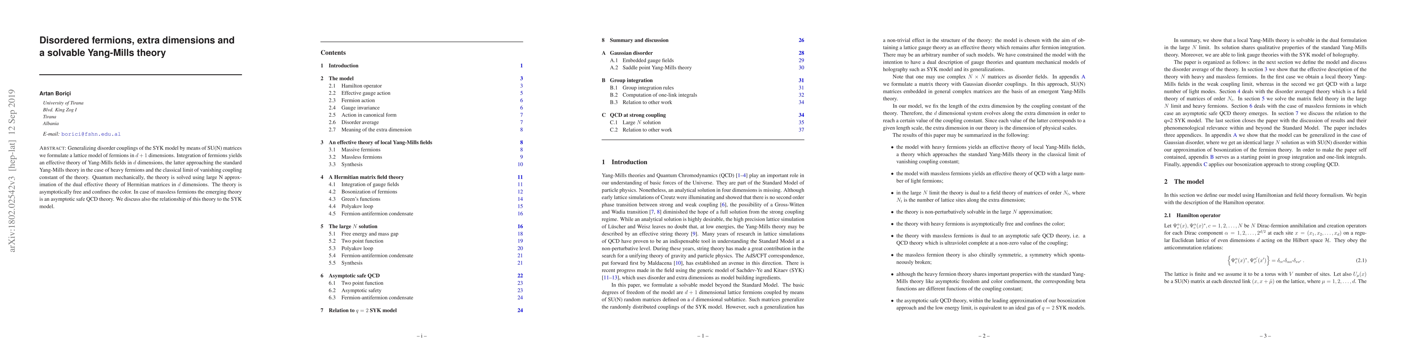 Generalizing disorder couplings of the SYK model by means of SU(N) matrices we formulate a lattice model of fermions in d+1 dimensions. Integration of fermions yields an effective theory of Yang-Mills fields in d dimensions, the latter approaching the standard Yang-Mills theory in the case of heavy fermions and the classical limit of vanishing coupling constant of the theory. Quantum mechanically, the theory is solved using large N approximation of the dual effective theory of Hermitian matrices in d dimensions. The theory is asymptotically free and confines the color. In case of massless fermions the emerging theory is an asymptotic safe QCD theory. We discuss also the relationship of this theory to the SYK model.