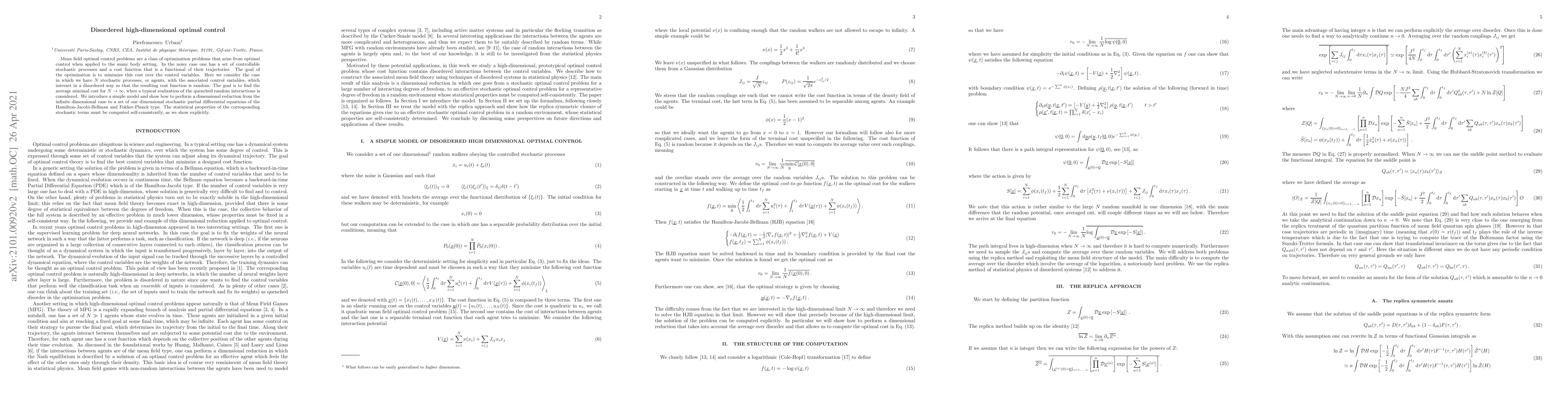 Mean field optimal control problems are a class of optimization problems that arise from optimal control when applied to the many body setting. In the noisy case one has a set of controllable stochastic processes and a cost function that is a functional of their trajectories. The goal of the optimization is to minimize this cost over the control variables. Here we consider the case in which we have $N$ stochastic processes, or agents, with the associated control variables, which interact in a disordered way so that the resulting cost function is random. The goal is to find the average minimal cost for $N\to \infty$, when a typical realization of the quenched random interactions is considered. We introduce a simple model and show how to perform a dimensional reduction from the infinite dimensional case to a set of one dimensional stochastic partial differential equations of the Hamilton-Jacobi-Bellman and Fokker-Planck type. The statistical properties of the corresponding stochastic terms must be computed self-consistently, as we show explicitly.