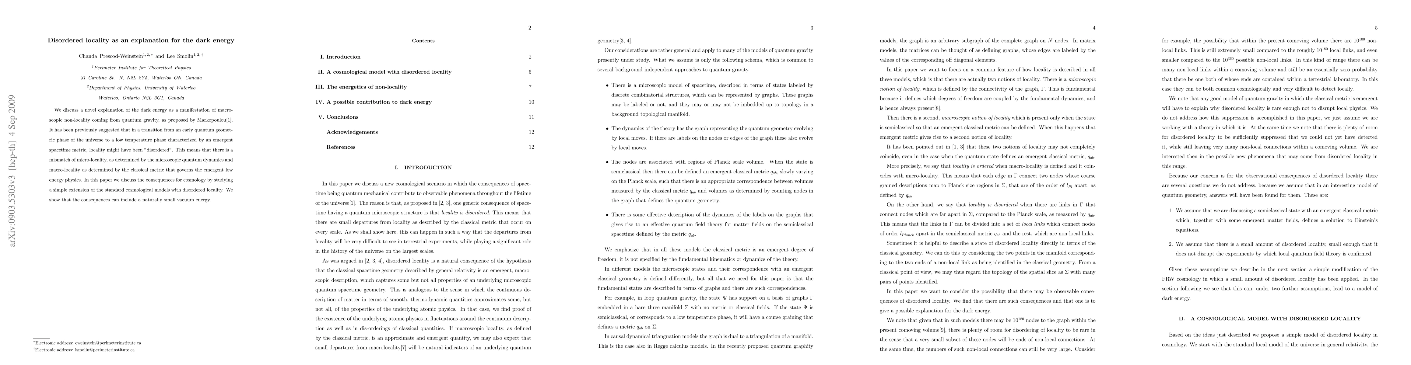 We discuss a novel explanation of the dark energy as a manifestation of macroscopic non-locality coming from quantum gravity, as proposed by Markopoulou. It has been previously suggested that in a transition from an early quantum geometric phase of the universe to a low temperature phase characterized by an emergent spacetime metric, locality might have been "disordered". This means that there is a mismatch of micro-locality, as determined by the microscopic quantum dynamics and macro-locality as determined by the classical metric that governs the emergent low energy physics. In this paper we discuss the consequences for cosmology by studying a simple extension of the standard cosmological models with disordered locality. We show that the consequences can include a naturally small vacuum energy.