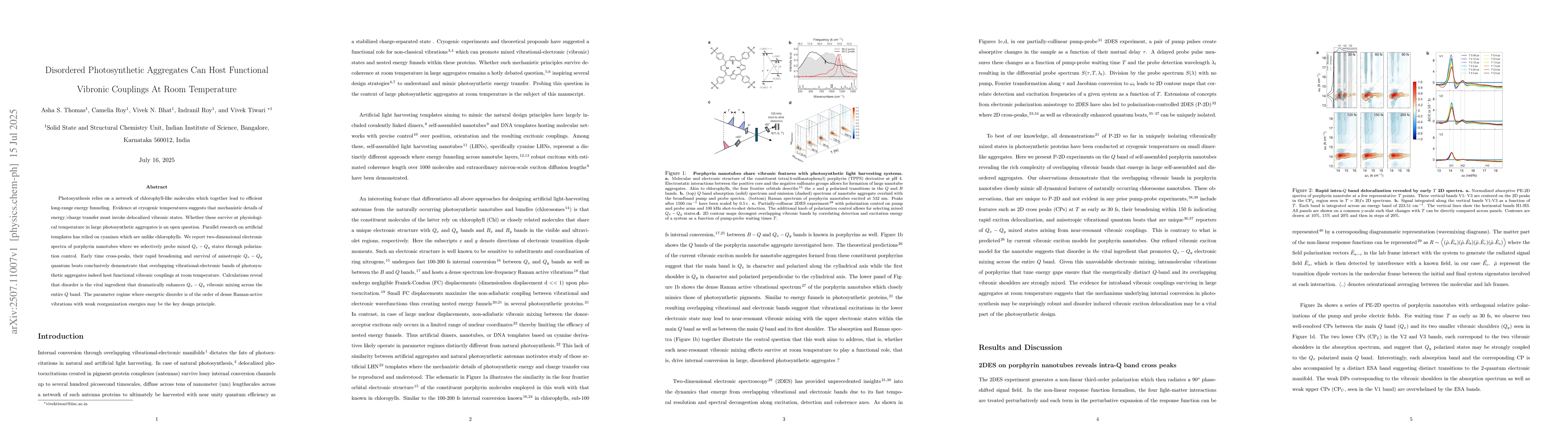 Photosynthesis relies on a network of chlorophyll-like molecules which together lead to efficient long-range energy funneling. Evidence at cryogenic temperatures suggests that mechanistic details of energy/charge transfer must invoke delocalized vibronic states. Whether these survive at physiological temperature in large photosynthetic aggregates is an open question. Parallel research on artificial templates has relied on cyanines which are unlike chlorophylls. We report two-dimensional electronic spectra of porphyrin nanotubes where we selectively probe mixed Qx-Qy states through polarization control. Early time cross-peaks, their rapid broadening and survival of anisotropic Qx-Qy quantum beats conclusively demonstrate that overlapping vibrational-electronic bands of photosynthetic aggregates indeed host functional vibronic couplings at room temperature. Calculations reveal that disorder is the vital ingredient that dramatically enhances Qx-Qy vibronic mixing across the entire Q band. The parameter regime where energetic disorder is of the order of dense Raman-active vibrations with weak reorganization energies may be the key design principle.