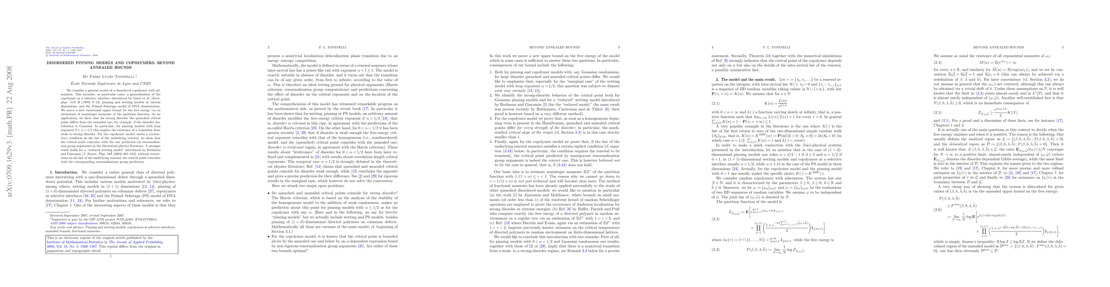 We consider a general model of a disordered copolymer with adsorption. This includes, as particular cases, a generalization of the copolymer at a selective interface introduced by Garel et al. [Europhys. Lett. 8 (1989) 9--13], pinning and wetting models in various dimensions, and the Poland--Scheraga model of DNA denaturation. We prove a new variational upper bound for the free energy via an estimation of noninteger moments of the partition function. As an application, we show that for strong disorder the quenched critical point differs from the annealed one, for example, if the disorder distribution is Gaussian. In particular, for pinning models with loop exponent $0<\alpha<1/2$ this implies the existence of a transition from weak to strong disorder. For the copolymer model, under a (restrictive) condition on the law of the underlying renewal, we show that the critical point coincides with the one predicted via renormalization group arguments in the theoretical physics literature. A stronger result holds for a "reduced wetting model" introduced by Bodineau and Giacomin [J. Statist. Phys. 117 (2004) 801--818]: without restrictions on the law of the underlying renewal, the critical point coincides with the corresponding renormalization group prediction.