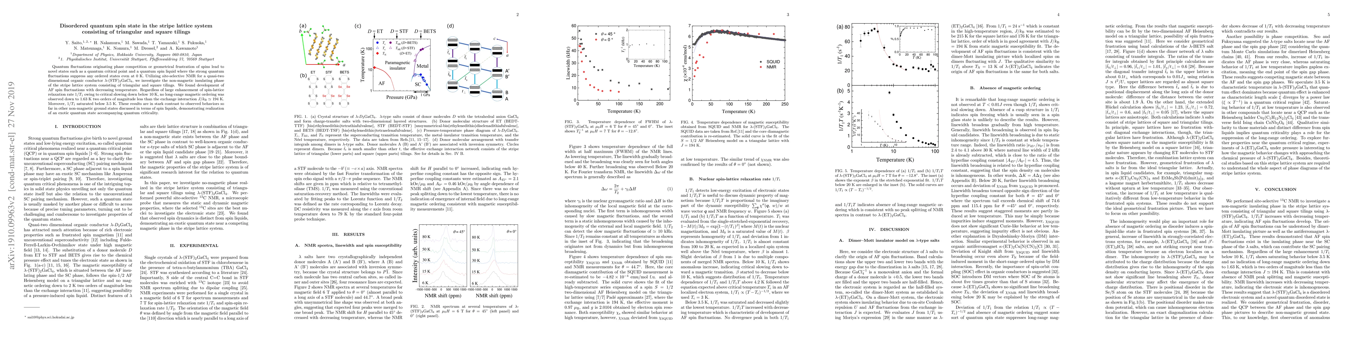 Quantum fluctuations originating phase competition or geometrical frustration of spins lead to novel states such as a quantum critical point and a quantum spin liquid where the strong quantum fluctuations suppress any ordered states even at 0 K. Utilizing site-selective NMR for a quasi-two dimensional organic conductor $\lambda$-(STF)$_2$GaCl$_4$, we investigate the non-magnetic insulating phase of the stripe lattice system consisting of triangular and square tilings. We found development of AF spin fluctuations with decreasing temperature. Regardless of large enhancement of spin-lattice relaxation rate $1/T_1$ owing to critical slowing down below 10 K, no long-range magnetic ordering was observed down to 1.63 K two orders of magnitude less than the exchange interaction $J/k_{\rm B} \simeq$ 194 K. Moreover, $1/T_1$ saturated below 3.5 K. These results are in stark contrast to observed behaviors so far in other non-magnetic ground states discussed in terms of spin liquids, demonstrating realization of an exotic quantum state accompanying quantum criticality.