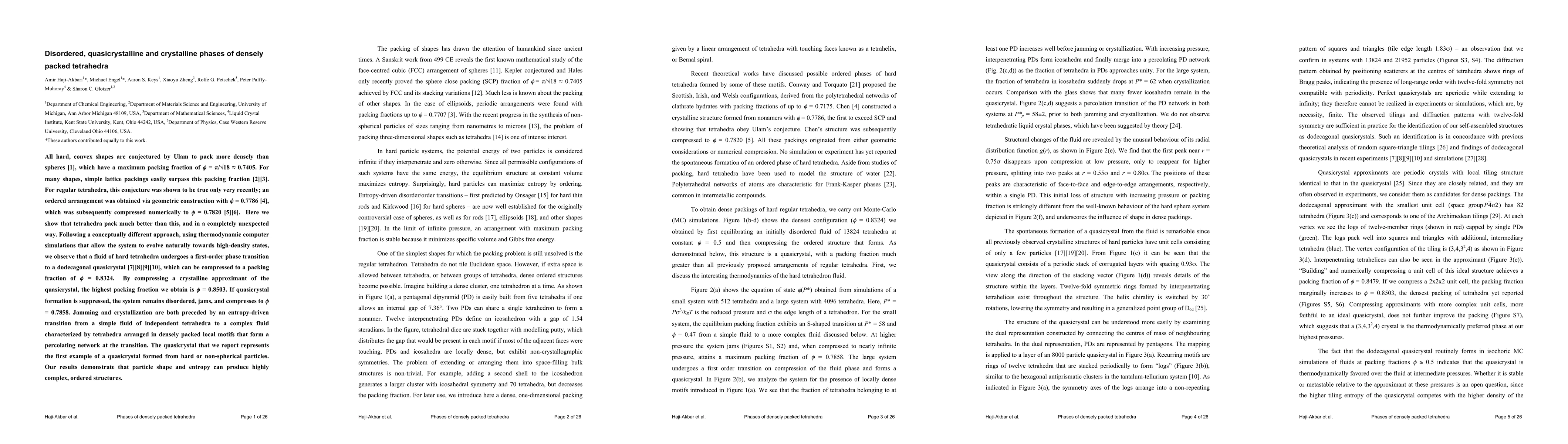 This paper demonstrates that hard tetrahedra can pack more densely than spheres, achieving packing fractions of up to 0.8503 through the formation of a dodecagonal quasicrystal and a crystalline approximant, challenging Ulam's conjecture. The study reveals that entropy-driven transitions lead to complex ordered structures beyond simple lattice packings.