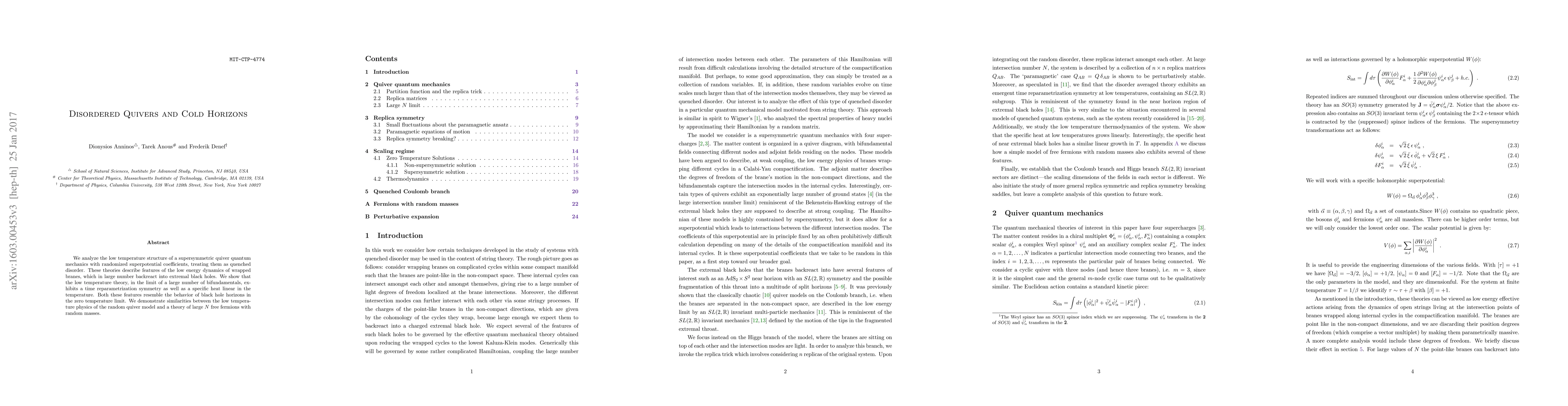 We analyze the low temperature structure of a supersymmetric quiver quantum mechanics with randomized superpotential coefficients, treating them as quenched disorder. These theories describe features of the low energy dynamics of wrapped branes, which in large number backreact into extremal black holes. We show that the low temperature theory, in the limit of a large number of bifundamentals, exhibits a time reparametrization symmetry as well as a specific heat linear in the temperature. Both these features resemble the behavior of black hole horizons in the zero temperature limit. We demonstrate similarities between the low temperature physics of the random quiver model and a theory of large $N$ free fermions with random masses.