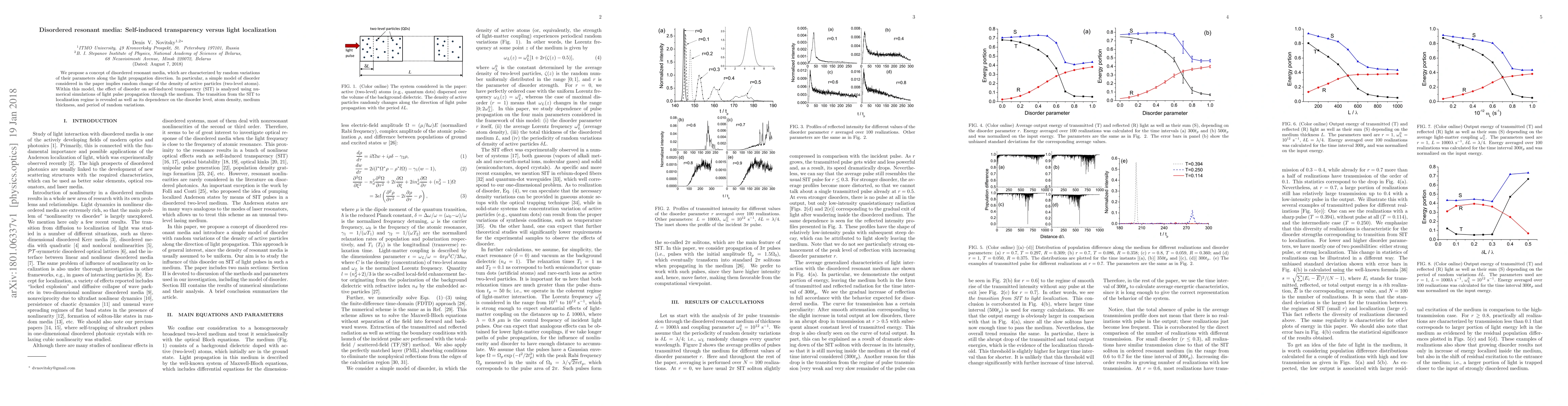 This paper explores disordered resonant media with random variations in active particle density, analyzing the transition from self-induced transparency to light localization through numerical simulations. It reveals how factors like disorder level, atom density, medium thickness, and variation period influence this transition.