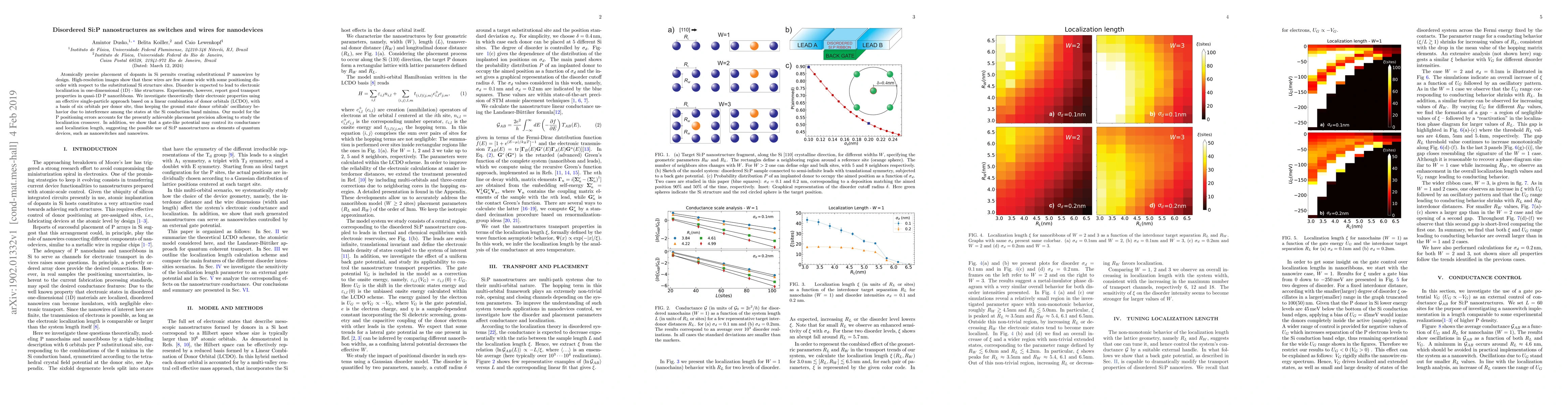 Atomically precise placement of dopants in Si permits creating substitutional P nanowires by design. High-resolution images show that these wires are few atoms wide with some positioning disorder with respect to the substitutional Si structure sites. Disorder is expected to lead to electronic localization in one-dimensional (1D) - like structures. Experiments, however, report good transport properties in quasi-1D P nanoribbons. We investigate theoretically their electronic properties using an effective single-particle approach based on a linear combination of donor orbitals (LCDO), with a basis of six orbitals per donor site, thus keeping the ground state donor orbitals' oscillatory behavior due to interference among the states at the Si conduction band minima. Our model for the P positioning errors accounts for the presently achievable placement precision allowing to study the localization crossover. In addition, we show that a gate-like potential may control its conductance and localization length, suggesting the possible use of Si:P nanostructures as elements of quantum devices, such as nanoswitches and nanowires.