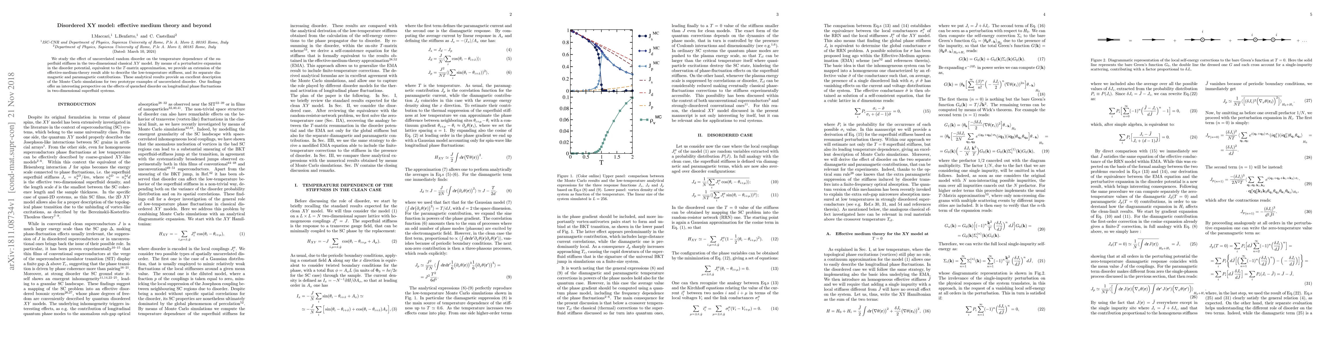 We study the effect of uncorrelated random disorder on the temperature dependence of the superfluid stiffness in the two-dimensional classical XY model. By means of a perturbative expansion in the disorder potential, equivalent to the T-matrix approximation, we provide an extension of the effective-medium-theory result able to describe the low-temperature stiffness, and its separate diamagnetic and paramagnetic contributions. These analytical results provide an excellent description of the Monte Carlo simulations for two prototype examples of uncorrelated disorder. Our findings offer an interesting perspective on the effects of quenched disorder on longitudinal phase fluctuations in two-dimensional superfluid systems.