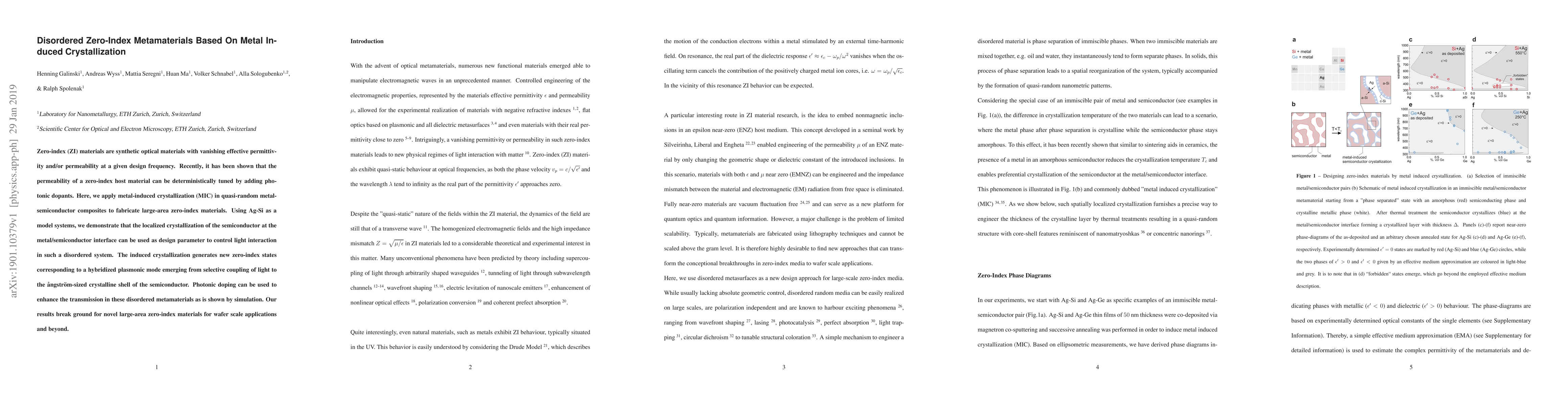 This paper explores the fabrication of large-area disordered zero-index metamaterials using metal-induced crystallization in Ag-Si composites, demonstrating that localized crystallization at metal/semiconductor interfaces can control light interaction. Photonic doping enhances transmission, paving the way for novel applications in wafer-scale technologies.