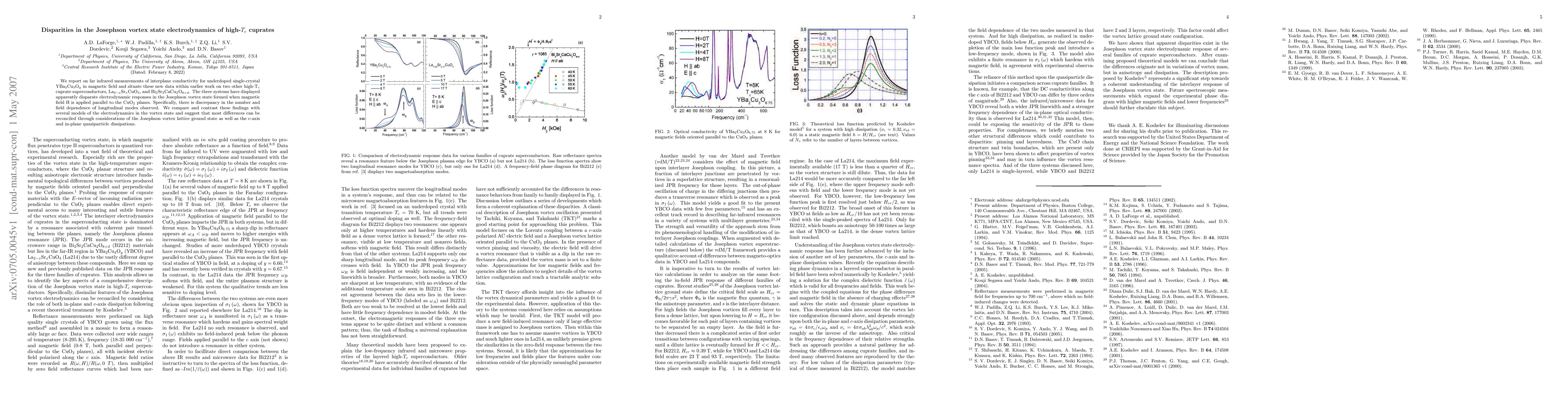 We report on far infrared measurements of interplane conductivity for underdoped single-crystal YBa2Cu3Oy in magnetic field and situate these new data within earlier work on two other high-Tc cuprate superconductors, La(2-x)SrxCuO4 and Bi2Sr2CaCu2O(8+d). The three systems have displayed apparently disparate electrodynamic responses in the Josephson vortex state formed when magnetic field H is applied parallel to the CuO2 planes. Specifically, there is discrepancy in the number and field dependence of longitudinal modes observed. We compare and contrast these findings with several models of the electrodynamics in the vortex state and suggest that most differences can be reconciled through considerations of the Josephson vortex lattice ground state as well as the c-axis and in-plane quasiparticle dissipations.