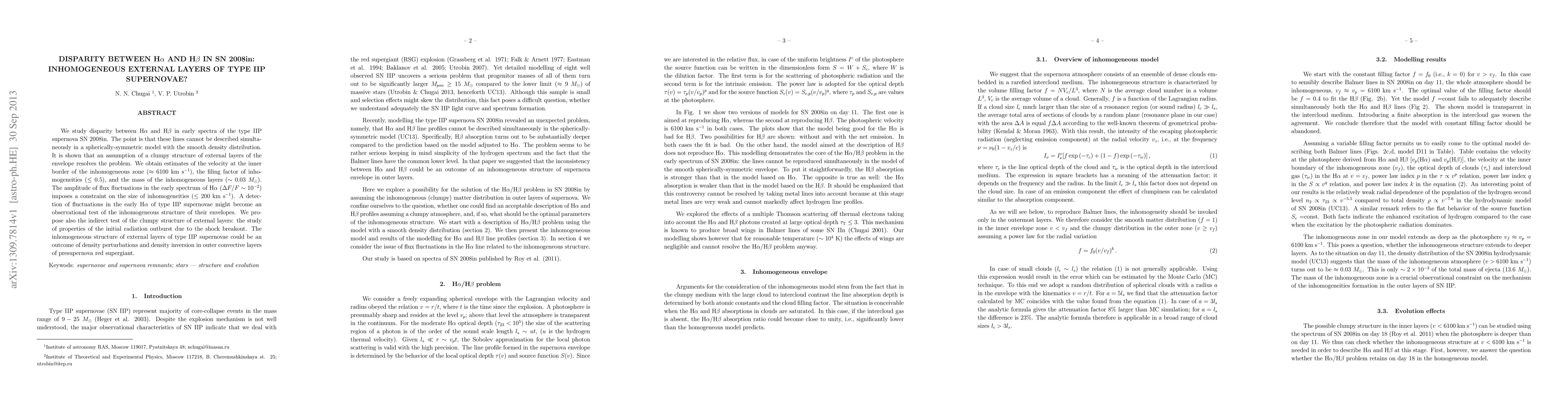 We study disparity between H\alpha\ and H\beta\ in early spectra of the type IIP supernova SN 2008in. The point is that these lines cannot be described simultaneously in a spherically-symmetric model with the smooth density distribution. It is shown that an assumption of a clumpy structure of external layers of the envelope resolves the problem. We obtain estimates of the velocity at the inner border of the inhomogeneous zone (\approx6100 km s^{-1}), the filing factor of inhomogeneities (\leq0.5), and the mass of the inhomogeneous layers (~ 0.03 M_{\odot}). The amplitude of flux fluctuations in the early spectrum of H\alpha\ (\Delta F/F ~ 10^{-2}) imposes a constraint on the size of inhomogeneities (\leq 200 km s^{-1}). A detection of fluctuations in the early H\alpha\ of type IIP supernovae might become an observational test of the inhomogeneous structure of their envelopes. We propose also the indirect test of the clumpy structure of external layers: the study of properties of the initial radiation outburst due to the shock breakout. The inhomogeneous structure of external layers of type IIP supernovae could be an outcome of density perturbations and density inversion in outer convective layers of presupernova red supergiant.