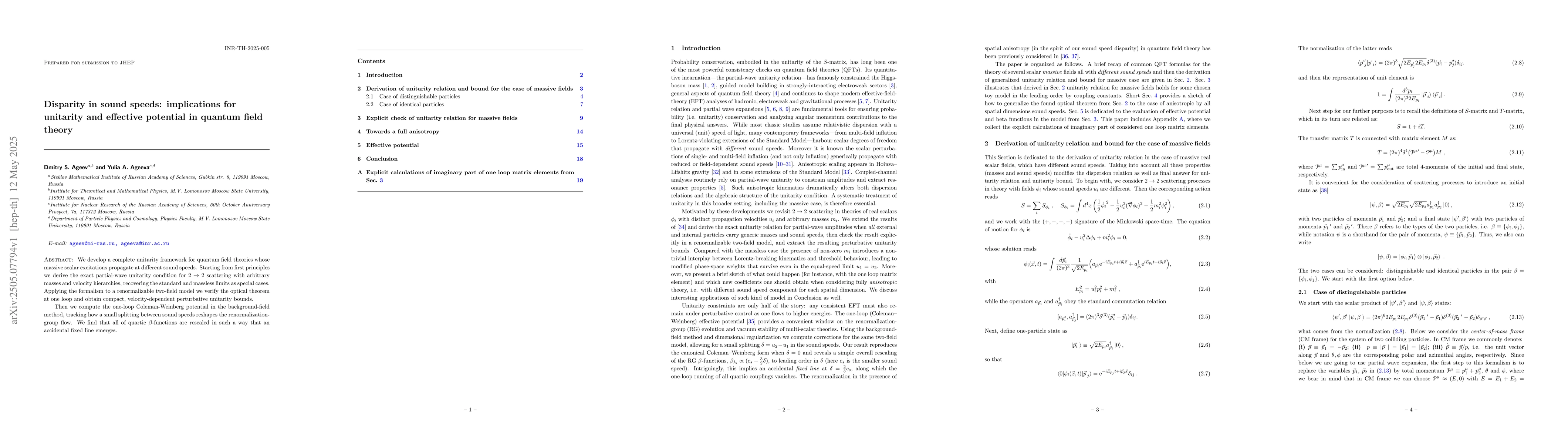 The main technical contribution is the development of a unitarity framework that accommodates varying sound speeds in quantum field theories, along with deriving exact unitarity conditions and demonstrating their application in a two-field model.