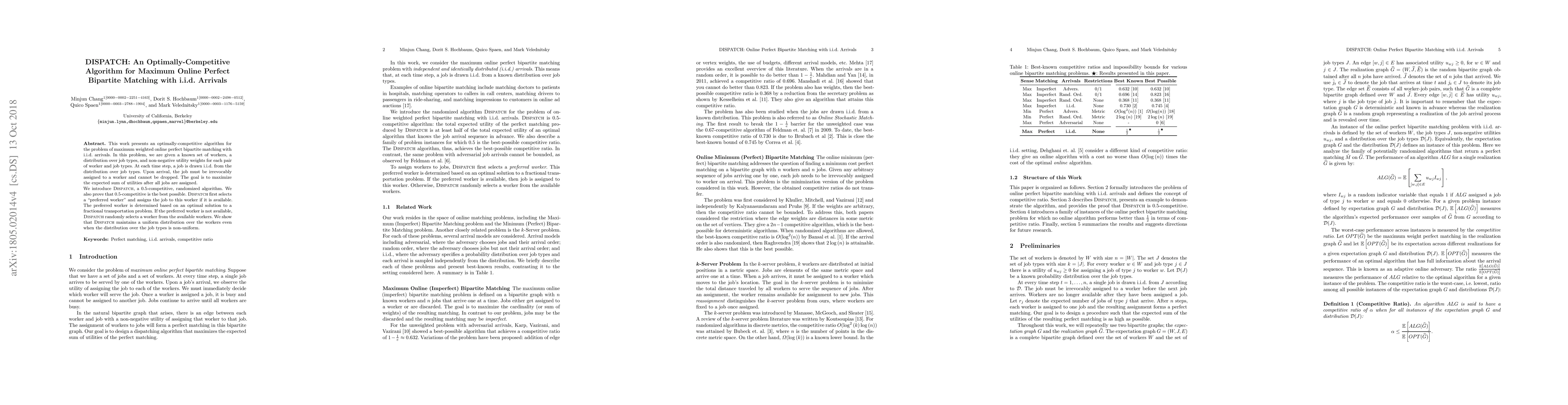 This work presents an optimally-competitive algorithm for the problem of maximum weighted online perfect bipartite matching with i.i.d. arrivals. In this problem, we are given a known set of workers, a distribution over job types, and non-negative utility weights for each pair of worker and job types. At each time step, a job is drawn i.i.d. from the distribution over job types. Upon arrival, the job must be irrevocably assigned to a worker and cannot be dropped. The goal is to maximize the expected sum of utilities after all jobs are assigned. We introduce DISPATCH, a 0.5-competitive, randomized algorithm. We also prove that 0.5-competitive is the best possible. DISPATCH first selects a "preferred worker" and assigns the job to this worker if it is available. The preferred worker is determined based on an optimal solution to a fractional transportation problem. If the preferred worker is not available, DISPATCH randomly selects a worker from the available workers. We show that DISPATCH maintains a uniform distribution over the workers even when the distribution over the job types is non-uniform.