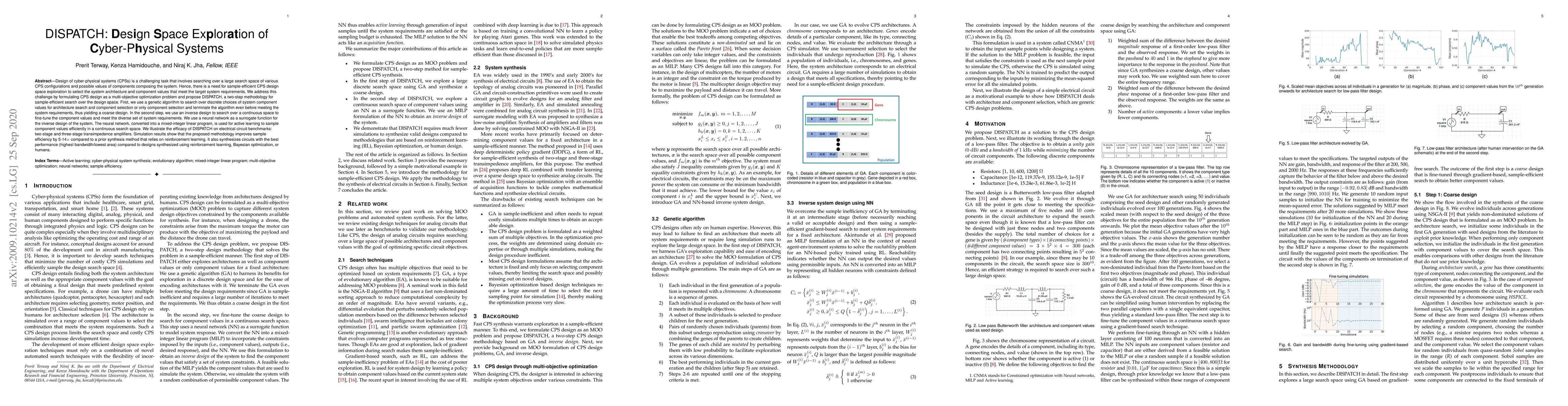 Design of cyber-physical systems (CPSs) is a challenging task that involves searching over a large search space of various CPS configurations and possible values of components composing the system. Hence, there is a need for sample-efficient CPS design space exploration to select the system architecture and component values that meet the target system requirements. We address this challenge by formulating CPS design as a multi-objective optimization problem and propose DISPATCH, a two-step methodology for sample-efficient search over the design space. First, we use a genetic algorithm to search over discrete choices of system component values for architecture search and component selection or only component selection and terminate the algorithm even before meeting the system requirements, thus yielding a coarse design. In the second step, we use an inverse design to search over a continuous space to fine-tune the component values and meet the diverse set of system requirements. We use a neural network as a surrogate function for the inverse design of the system. The neural network, converted into a mixed-integer linear program, is used for active learning to sample component values efficiently in a continuous search space. We illustrate the efficacy of DISPATCH on electrical circuit benchmarks: two-stage and three-stage transimpedence amplifiers. Simulation results show that the proposed methodology improves sample efficiency by 5-14x compared to a prior synthesis method that relies on reinforcement learning. It also synthesizes circuits with the best performance (highest bandwidth/lowest area) compared to designs synthesized using reinforcement learning, Bayesian optimization, or humans.